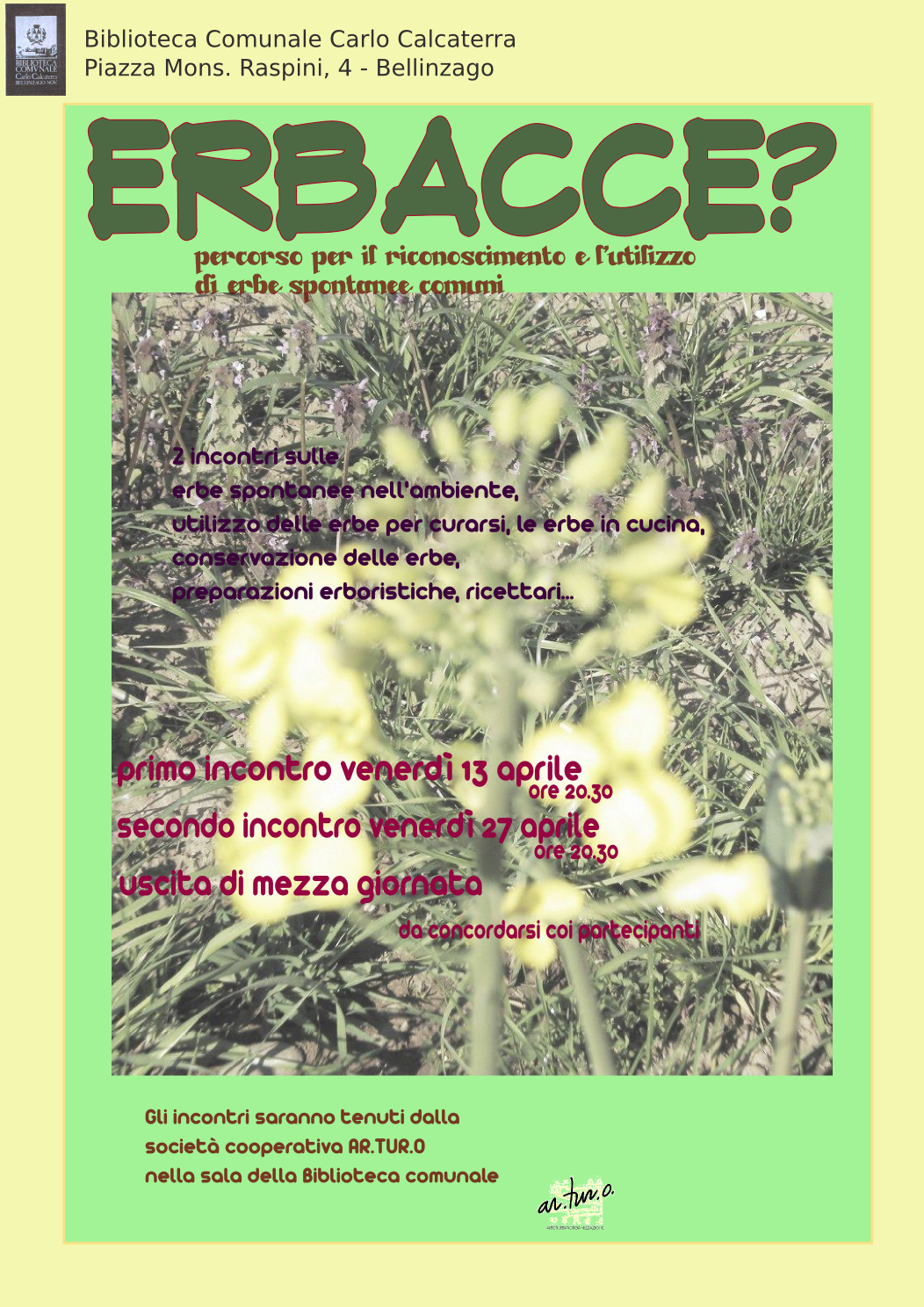 LA BIBLIOTECA COMUNALE ricorda la seconda serata su “ERBACCE ?” le erbe spontanee nell'ambiente prevista per stasera alle ore 20,30 presso la Biblioteca. Relatrice Rosella Conti, esperta naturalista della Coop. AR.TUR.O.-www.arturonline.org Nella serata saranno presentati alcuni campioni di erbe spontanee comuni, con illustrazione e classificazione, modi di utilizzo dei campioni raccolti e delle erbe spontanee, da quello terapeutico a quello culinario, modalità di conservazione, preparazioni erboristiche, confronto sulle esperienze e conoscenze dei partecipanti, raccolta delle ricette portate dai partecipanti per la realizzazione di un semplice ricettario. Nella serata sarà anche stabilita l'escursione prevista e l'eventualità di realizzare, per l’uscita, un momento conviviale in area attrezzata (aperitivo al sacco, merenda sinoira, a seconda di quale sarà l’orario scelto per l’uscita) in cui chi vuole porta la “sua” ricetta (realizzata a casa), da condividere con i partecipanti.