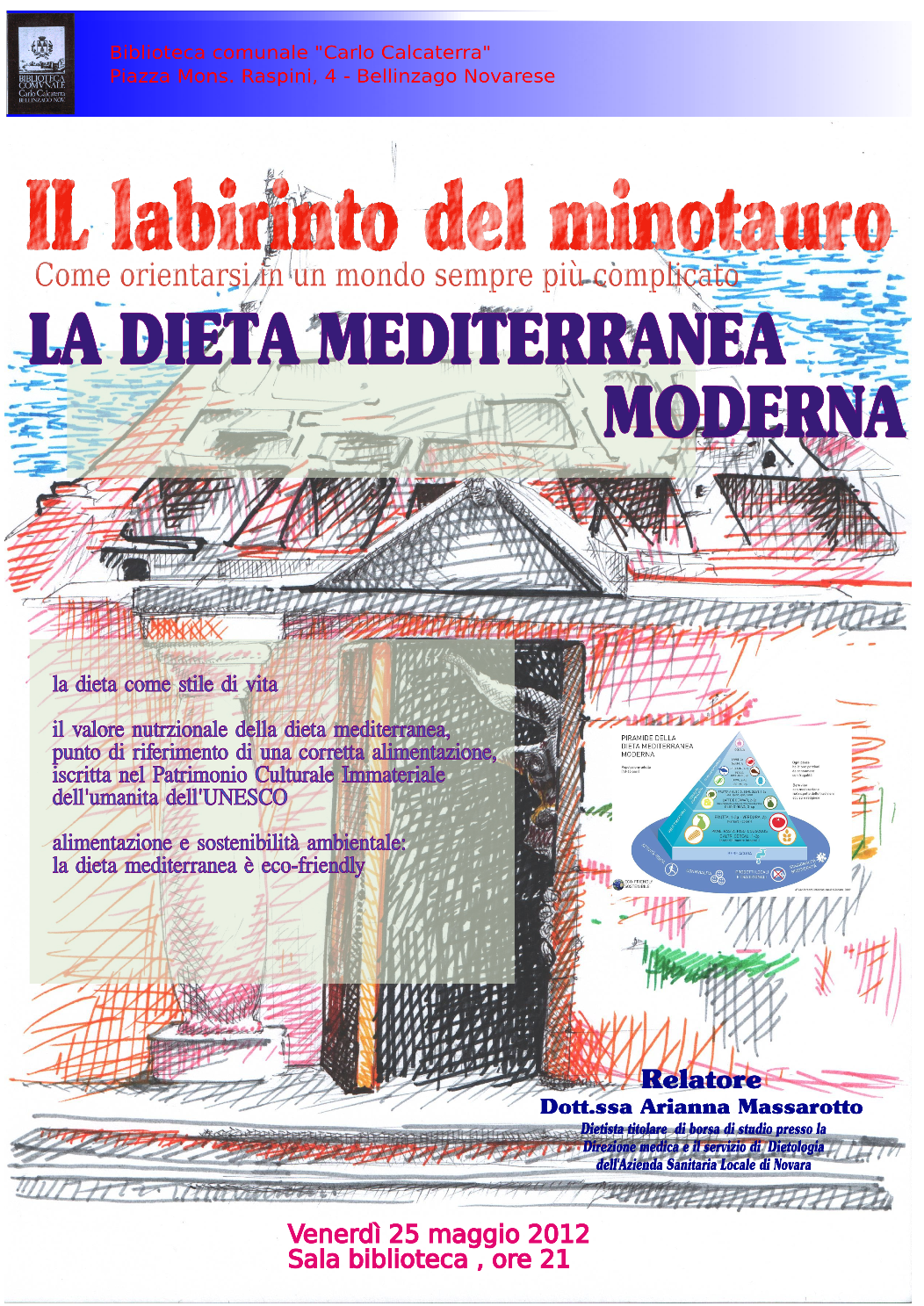 Venerdì 25 maggio p.v. nell'ambito dell'iniziativa ideata dal Consiglio di Biblioteca denominata "Il labirinto del Minotauro" è organizzata, presso la Sala conferenze della Biblioteca comunale, alle ore 21,00, una conferenza tenuta dalla Dott.ssa MASSAROTTO Arianna -dietista titolare di borsa di studio presso il servizio di dietologia del SIAN ASL 13 di Novara- denominata “La Dieta Mediterranea Moderna” - La conferenza verterà sulle prospettive e gli aspetti della dieta mediterranea assunti come stile di vita e di cui alla specifica piramide alimentare e sul valore della stessa, quale punto di riferimento di una corretta alimentazione, iscritta nel Patrimonio Culturale Immateriale dell'Umanità dell'UNESCO.