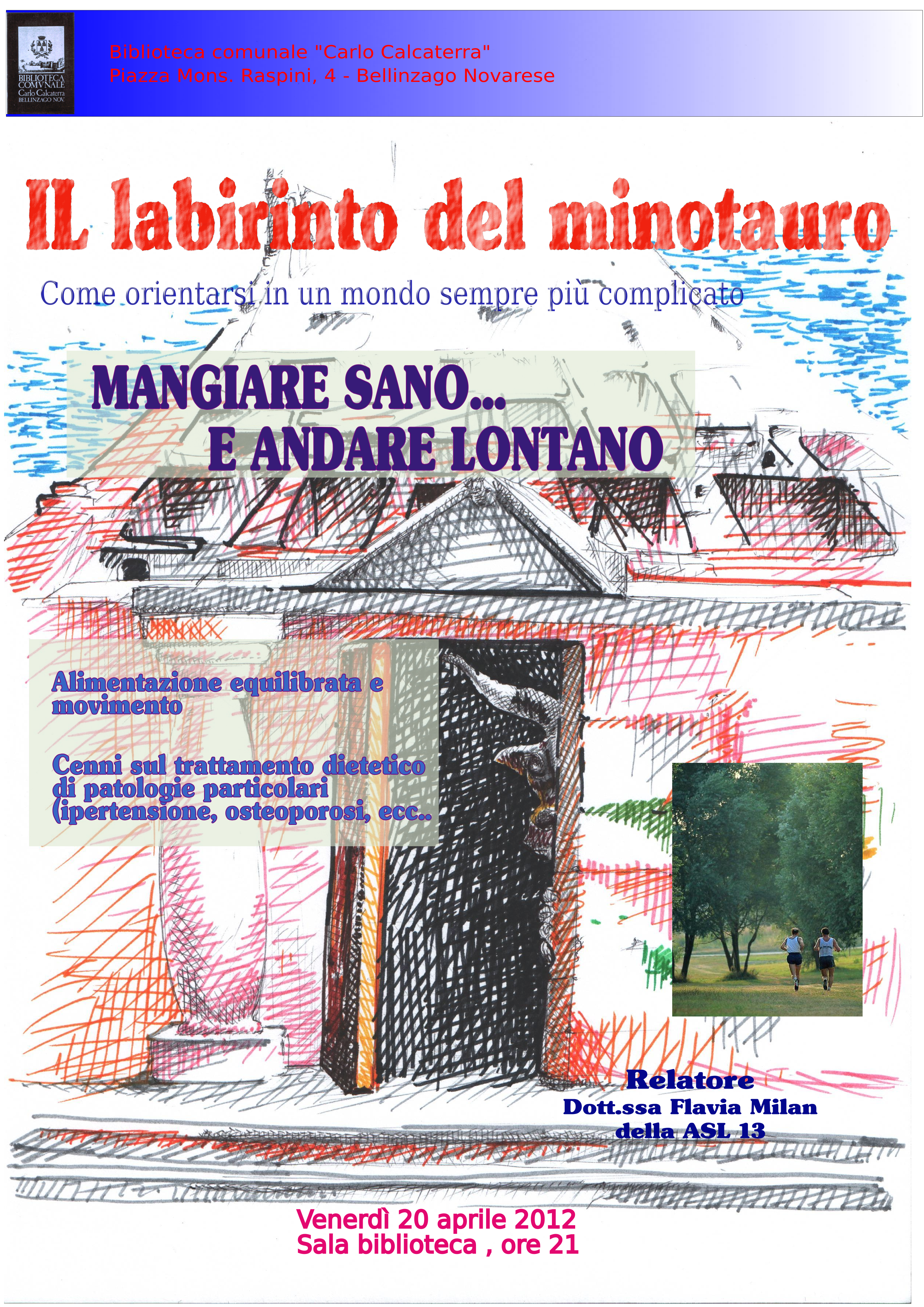 Venerdì 20 aprile p.v. nell'ambito dell'iniziativa ideata dal Consiglio di Biblioteca denominata "Il labirinto del Minotauro" è organizzata, presso la Sala conferenze della Biblioteca comunale alle ore 21,00, una conferenza tenuta dalla Dott.ssa MILAN Flavia del SIAN ASL 13 di Arona denominata “Mangiare sano e andare lontano” per la promozione della corretta alimentazione e di uno stile di vita sano che prevede il consumo di cibi equilibrati e regolare attività motoria e con accenni sui trattamenti dietoterapici in caso di particolari patologie, quali ipertensione, osteoporosi, ecc.