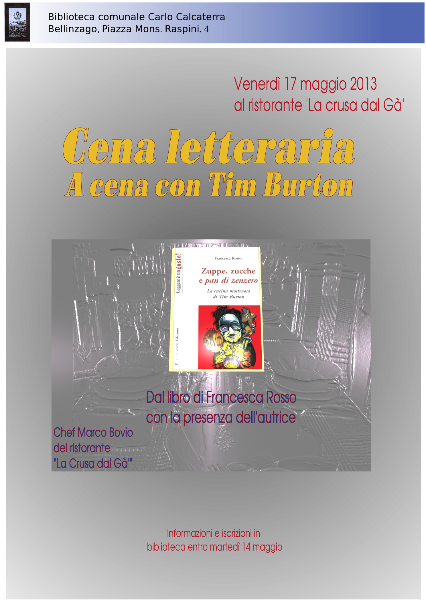 Dal libro di Francesca ROSSO "Zuppe, zucche e pan di zenzero" è stata organizzata dal Consiglio di Biblioteca, per il 17 maggio alle ore 20,00, una Cena Letteraria con la presenza dell'autrice.