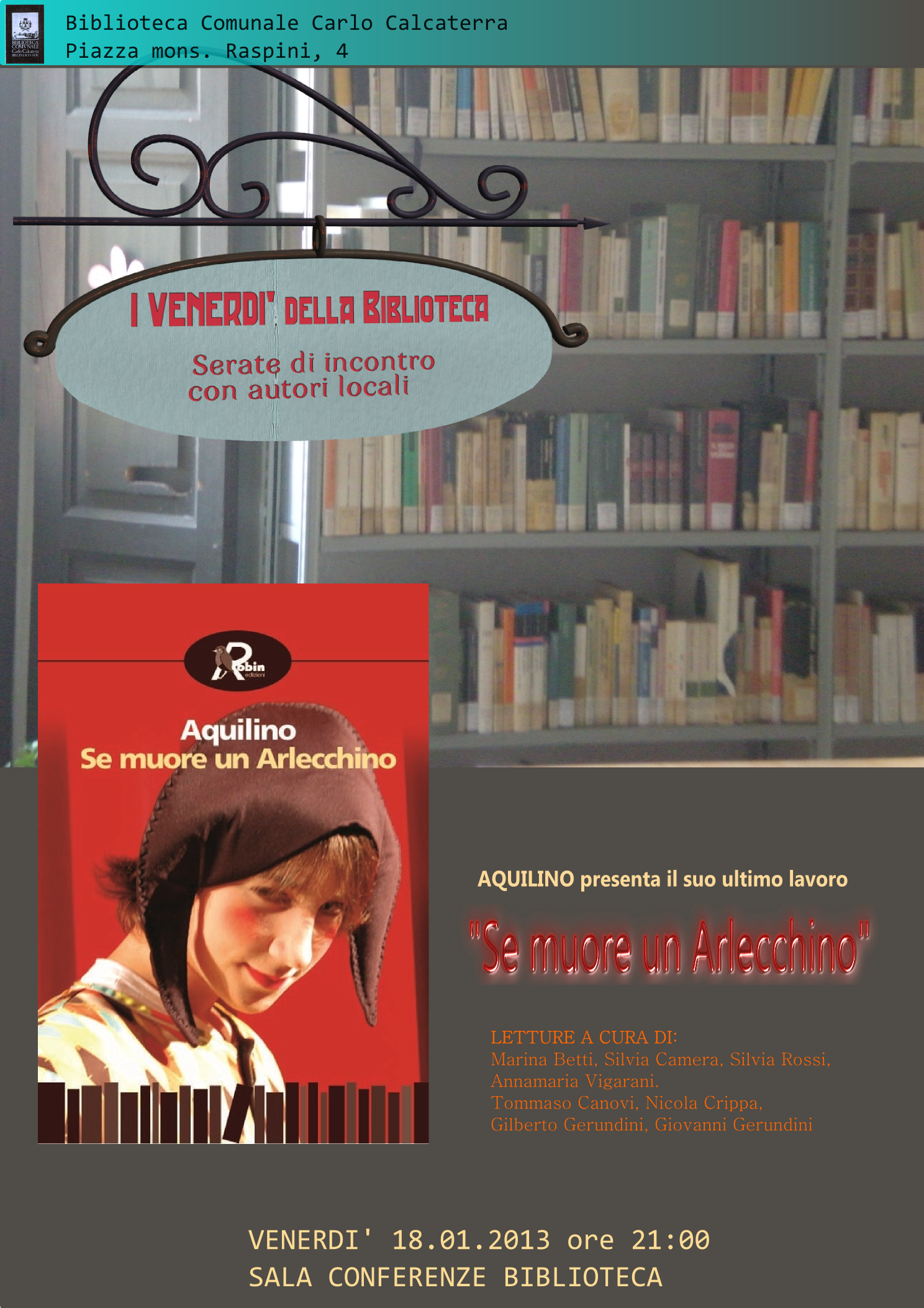 Venerdì 18 gennaio 2013, alle ore 21,00 presso la Sala Conferenze della Biblioteca comunale, l'autore Aquilino presenterà il suo ultimo libro dal titolo "Se muore un Arlecchino".