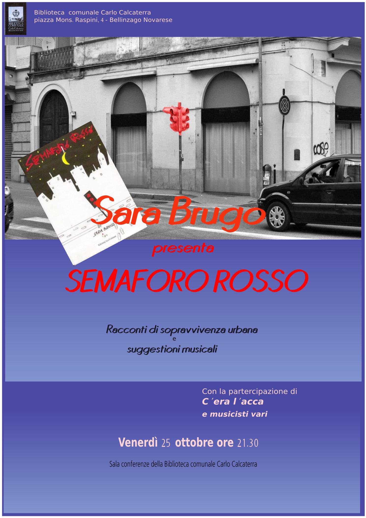La Biblioteca comunale organizza per Venerdì 25 ottobre 2013 alle ore 21,30, presso la Sala Conferenze della Biblioteca comunale, una serata di racconti e suggestioni musicali con Sara BRUGO, autrice del libro "SEMAFORO ROSSO", con i C'Era L'Acca ed alcuni giovani musicisti.