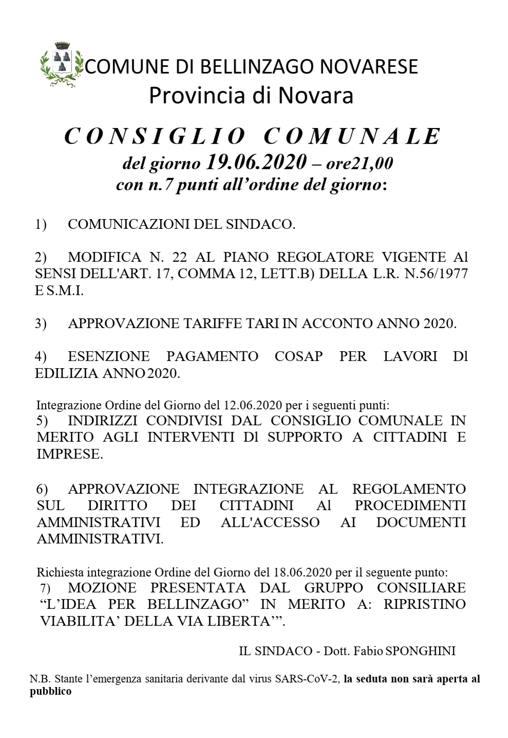 Questa sera si terrà il Consiglio Comunale con 7 punti all'ordine del giorno come da avviso allegato.
