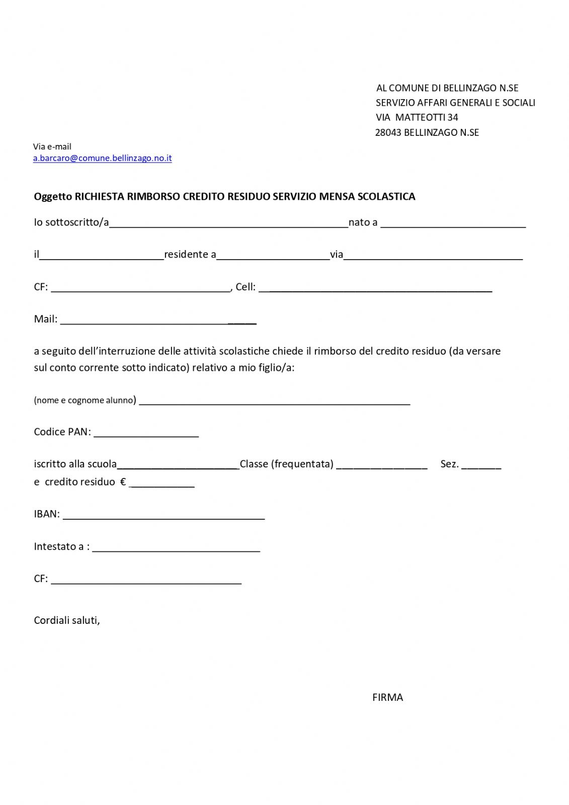 Nel modulo occorre indicare il codice IBAN necessario affinchè il Comune possa procedere al rimborso mediante bonifico bancario. Si prega di trasmettere il modulo così compilato al Servizio Affari Generali e Sociali al seguente indirizzo di posta elettronica: a.barcaro@comune.bellinzago.no.it.