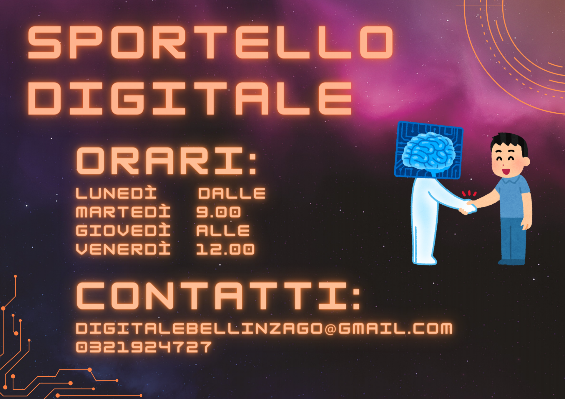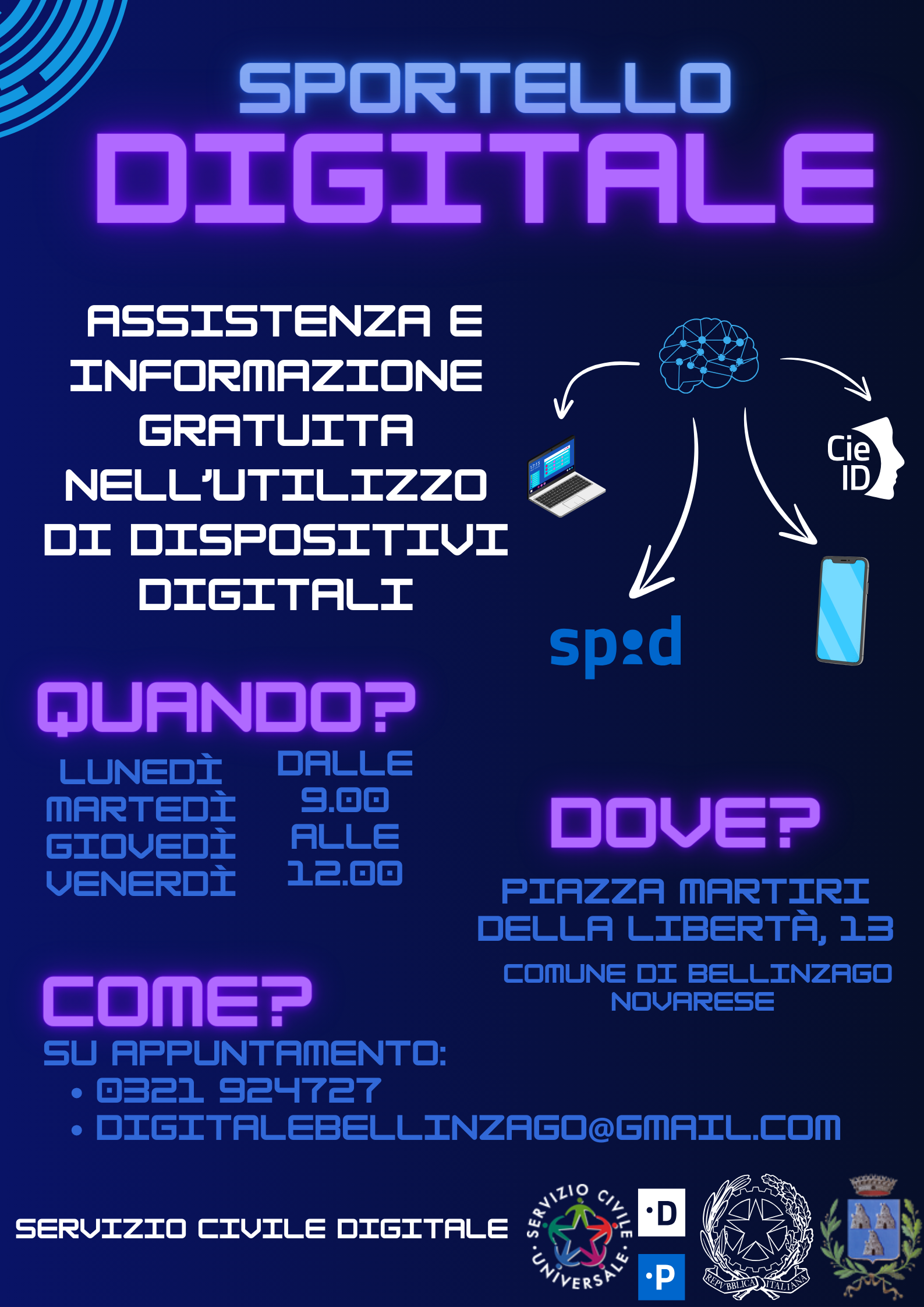 Lo sportello è attivo nei giorni di lunedì, martedì, giovedì e venerdì dalle ore 9.00 alle ore 12.00, su appuntamento da richiedere al numero 0321/924727 o scrivendo una email a digitalebellinzago@gmail.com.