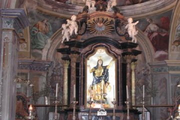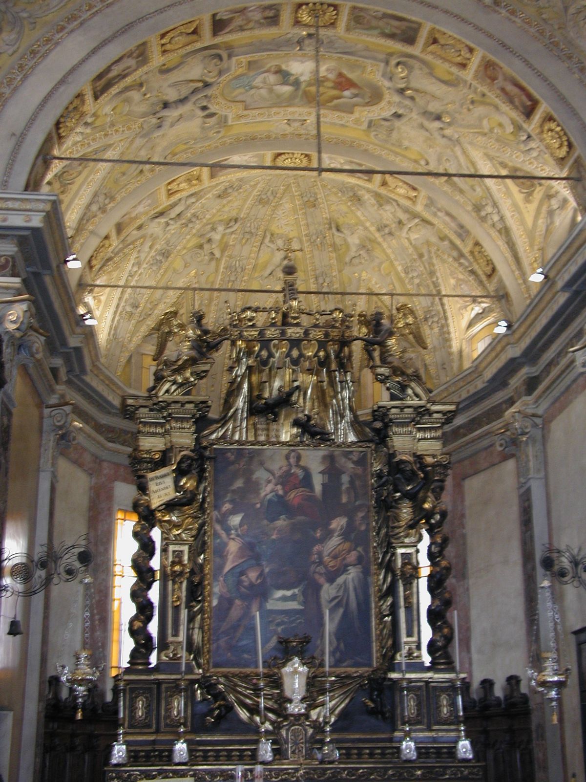 L'altare maggiore è grandioso: collocato al centro del presbiterio è l'elemento dominante della chiesa con le grandi colonne tortili e le sculture che lo arricchiscono. E' piacevole affidare la descrizione dell'altare alla penna di don Carlo Ardizio (1883-1961): "é essenzialmente formato dal basamento, dai due soliti gradini per i candelieri, dalla pala d'altare e da due nere colonne a tortiglione variamente sagomate, ornate nel mezzo da due magnifiche sculture di profeti, il tutto reggente un cornicione spezzato a orecchia e coperto da un drappeggio, scolpito pure nel legno, scendente da una corona, ben proporzionata e sorretta dalla chiave di volta e da legatura di ferro. Gli angeli a tutto corpo reggenti la corona, i vari putti alati sparsi in belle positure qua e là sui drappeggi, le due statue di profeti, le cornici, lo splendor dell'oro degli ornamenti sobrii, il mezzo oro e il nero bronzo ben applicati come fondo danno all'altare un risalto e una grazia tutta berniniana".