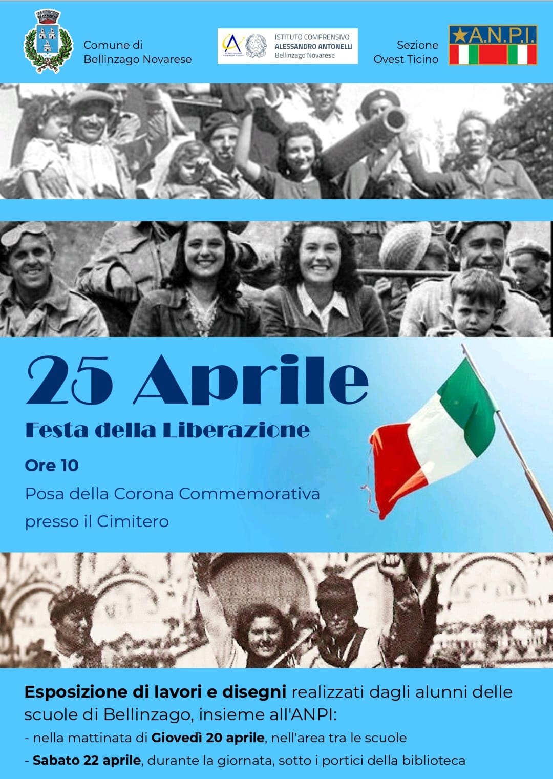 In occasione del 25 Aprile, grazie all'impegno di ANPI e dei docenti dell'istituto comprensivo Antonelli, i giovanissimi alunni di Bellinzago hanno realizzato lavori frutto di riflessioni e attività maturate in classe. L'esposizione di questi, inizialmente prevista nella mattinata del 20, come riportato sui manifesti, a causa del previsto maltempo sarà rinviata a mercoledì 26 nell'area tra le scuole e anticipata, sotto i portici della biblioteca civica, sabato 22. Martedì 25 aprile alle 10 sarà posata una corona commemorativa presso il cimitero.