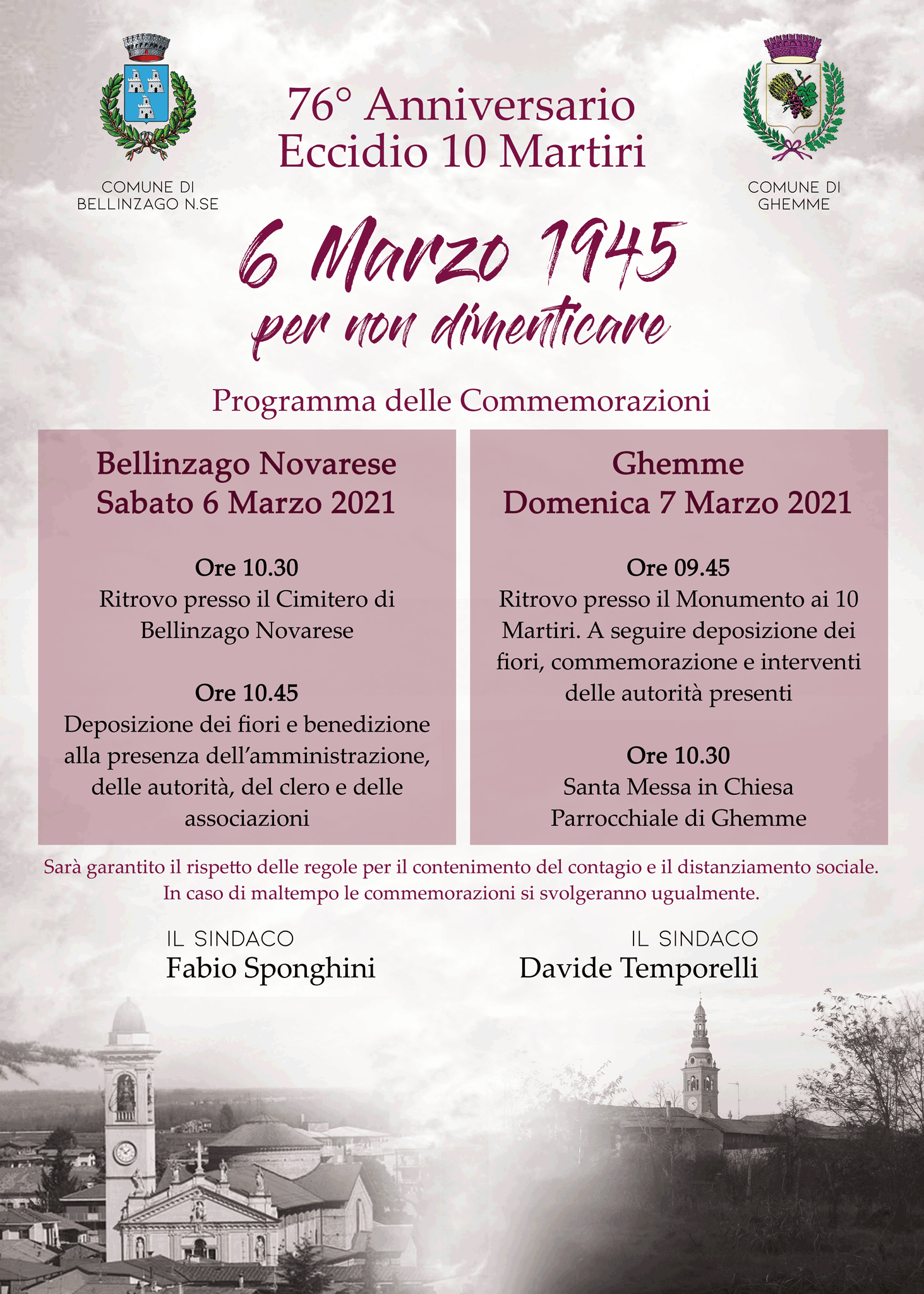invitano la cittadinanza ad intervenire alle cerimonie ufficiali di commemorazione che si terranno sabato 6 marzo p.v. presso il Cimitero di Bellinzago Novarese e domenica 7 marzo p.v. presso il Comune di Ghemme secondo il programma meglio specificato nel manifesto allegato.