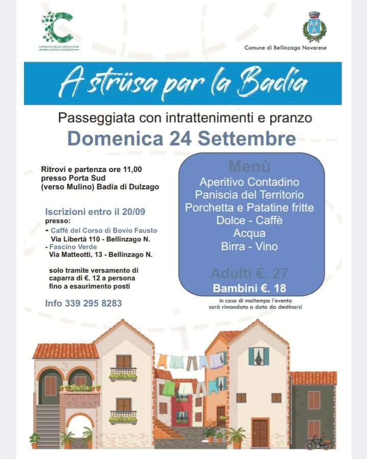 "A Strusa par la Badia - Passeggiata con intrattenimento e pranzo", dopo il rinvio per maltempo dello scorso luglio, viene riproposta domenica 24 settembre 2023, con ritrovo alle ore 11.00 presso la Badia di Dulzago.