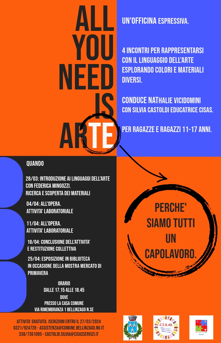 Una interessante opportunità di sperimentarsi con creatività, destinata a ragazzi tra gli 11 e i 17 anni, avrà luogo presso la Casa Comune tra marzo e aprile: l'esperienza prevede 4 incontri insieme a Nathali Vicidomini, una nostra concittadina dall'innato talento artistico che insieme a Silvia Castoldi, educatrice del Cisas, si metterà al servizio di quanti vorranno dare espressione a sè stessi attraverso l'arte.