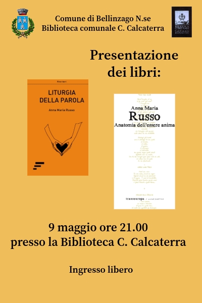 Si comunica che l'incontro previsto il giorno 9 maggio, alle ore 21.00, presso la Biblioteca comunale C. Calcaterra con l'autrice Anna Maria Russo per presentare e dialogare le sue due opere "Anatomia dell'essere anima" e "Liturgia della parola" è ANNULLATO.