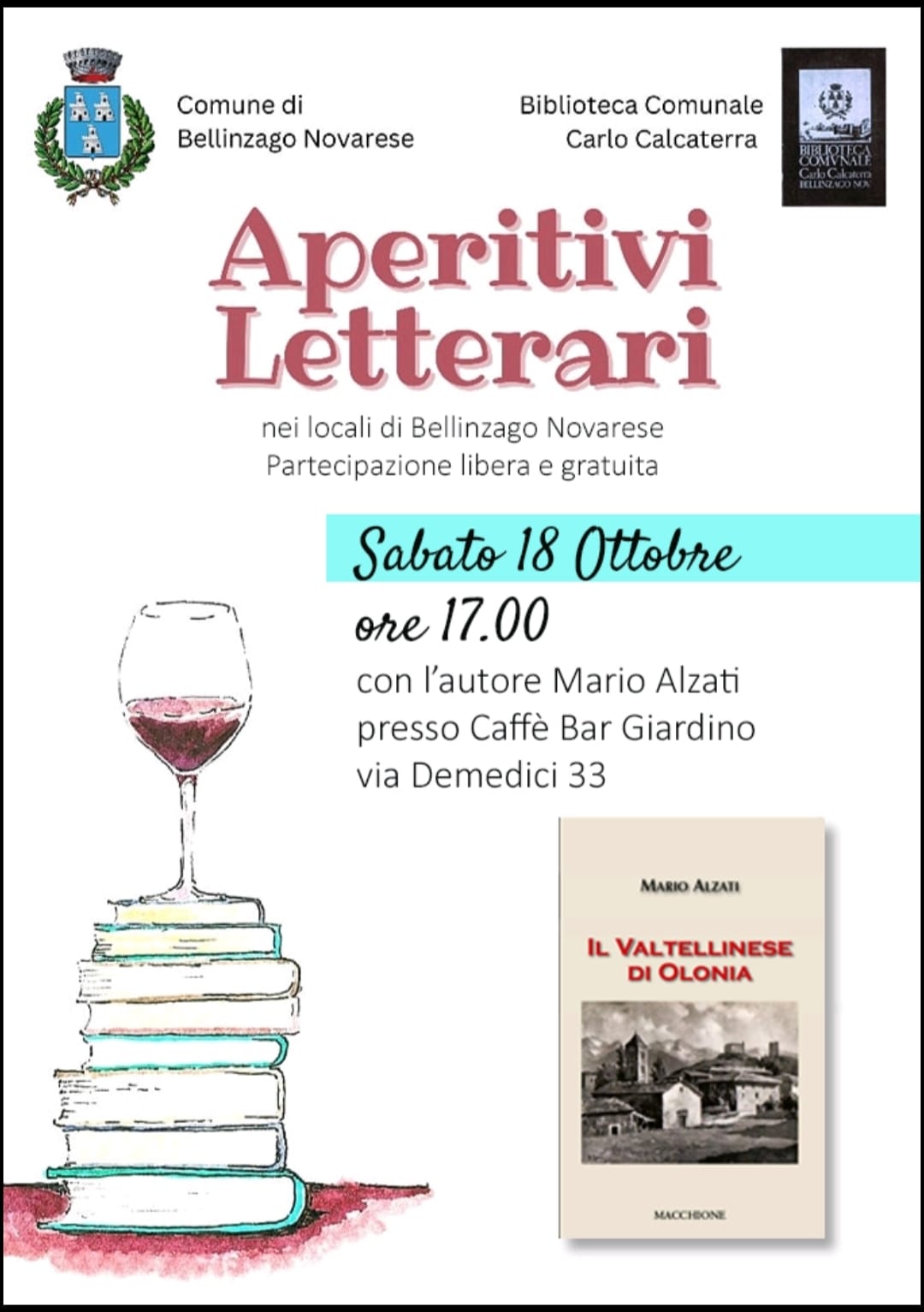 Ritornano gli appuntamenti con gli Aperitivi Letterari nei locali di Bellinzago N.se, a partecipazione libera e gratuita: sabato 18 ottobre alle ore 17.00 presso il Caffè Bar Giardino di via Demedici 33 dialogheremo con lo scrittore Mario Alzati e la sua opera "Il valtellinese di Olona".