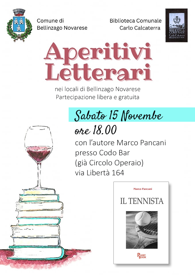 Continuano gli appuntamenti con gli Aperitivi letterari nei locali di Bellinzago Novarese: sabato 15 novembre, presso il Codo Bar (già Circolo operaio), alle ore 18.00, si parlerà del libro "Il tennista" con l'autore Marco Pancani.