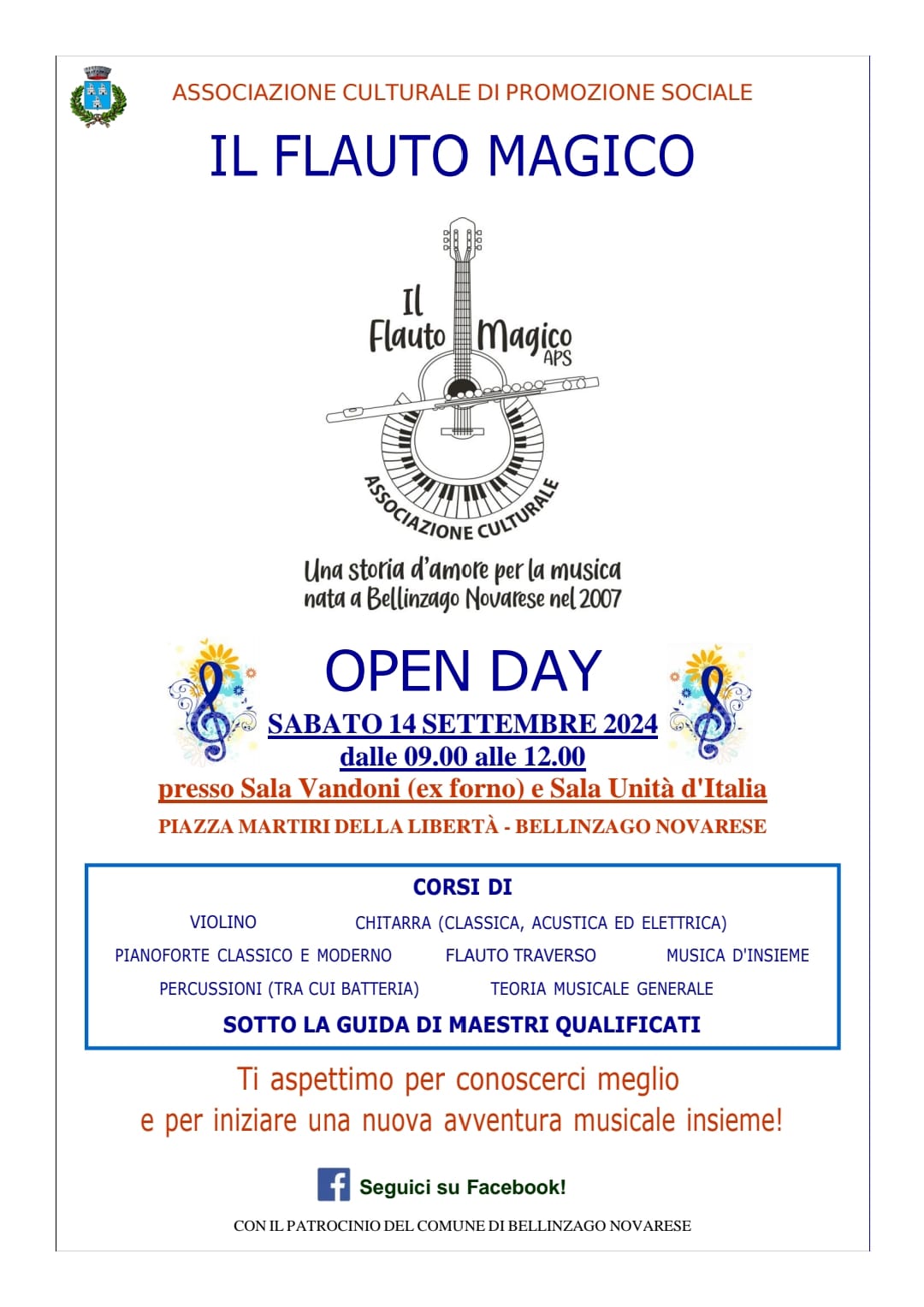 L'Associazione Culturale di Promozione Sociale "Il Flauto Magico" organizza per la mattinata di sabato 14 settembre l'Open Day in vista della ripresa delle attività musicali.
