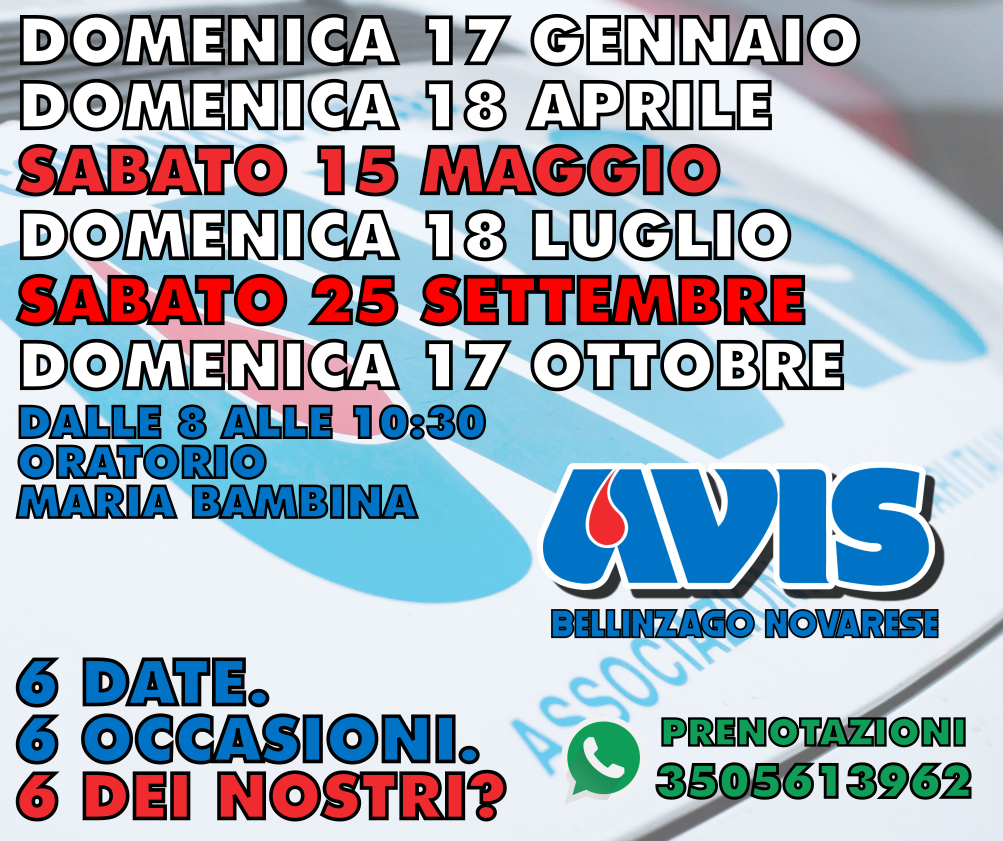 È necessario confermare la propria presenza per concordare l'orario preciso scrivendo su WhatsApp al 3505613962 oppure via mail a bellinzagonovarese.comunale@avis.it