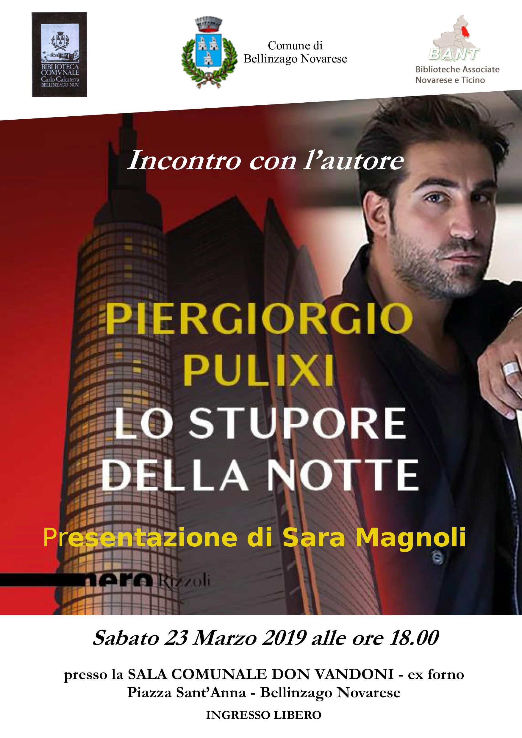 Nell'ambito della rassegna di autori organizzata dal coordinamento delle biblioteche del B.A.N.T. si rende noto che Sabato 23 marzo, alle ore 18,00 presso la sala Comunale Don Vandoni (ex forno) a Bellinzago Novarese lo scrittore Piergiorgio PULIXI presenterà il suo romanzo noir "Lo stupore della notte".