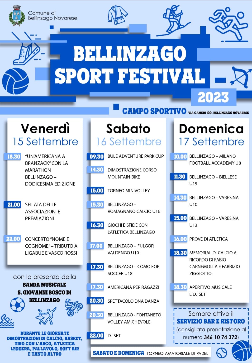 Seconda edizione del Bellinzago Sport Festival, evento che coinvolge le associazioni sportive del territorio e che si svolge presso il Centro Sportivo di via Cameri. Tre giorni di sport, eventi e festa per tutti, da venerdì 15 a domenica 17 settembre.