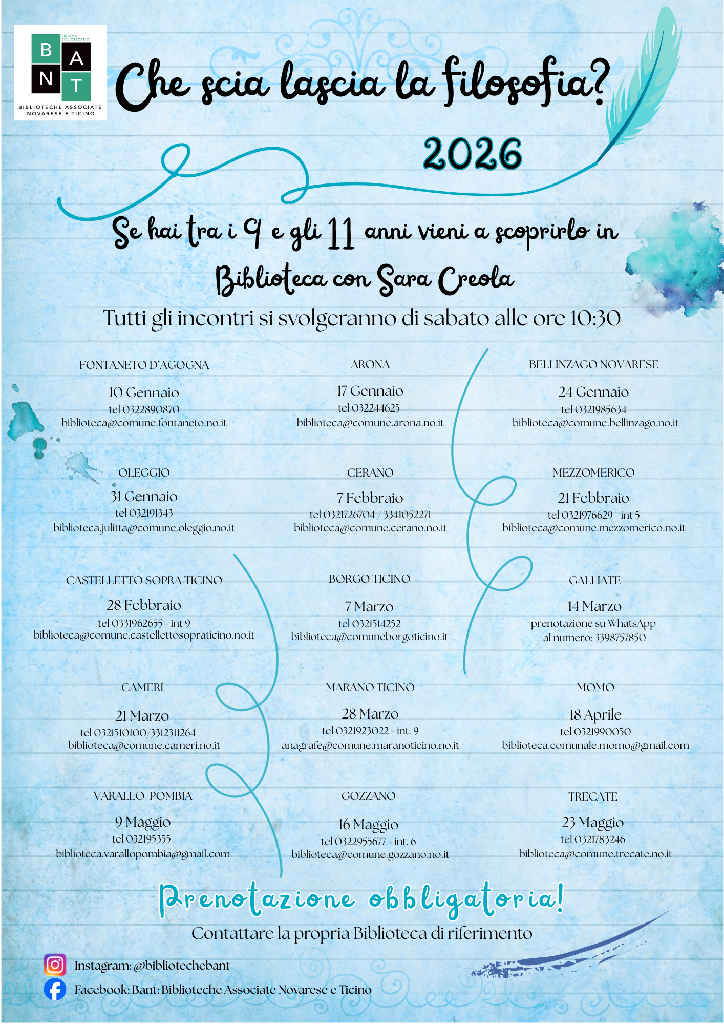 "Che scia lascia la filosofia?" è il nome del ciclo di laboratori organizzati dal BANT (Biblioteche Associate Novarese e Ticino) e rivolto ai bambini tra i 9 e gli 11 anni, curati da Sara Creola, docente di filosofia presso il liceo Fermi di Arona e autrice dei libri "La filosofia in... salsa verde finì" e "Il pescatore di idee".