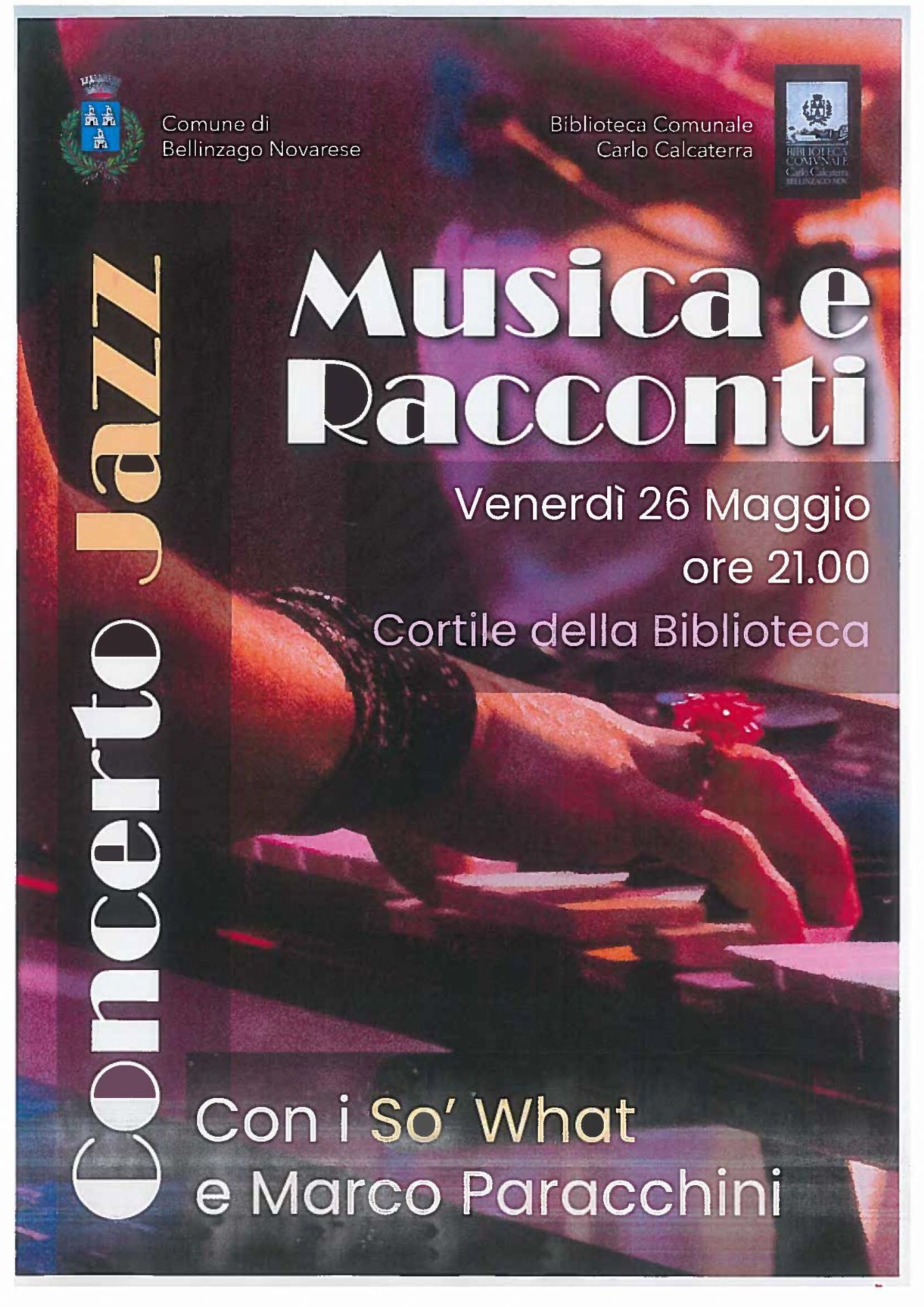 Venerdì 26 maggio, alle ore 21.00, presso il cortile della Biblioteca comunale, è in programma il concerto jazz con i musicisti So' What e Marco Paracchini, a cura dell’Associazione culturale Punto Zero di Busto Garolfo.