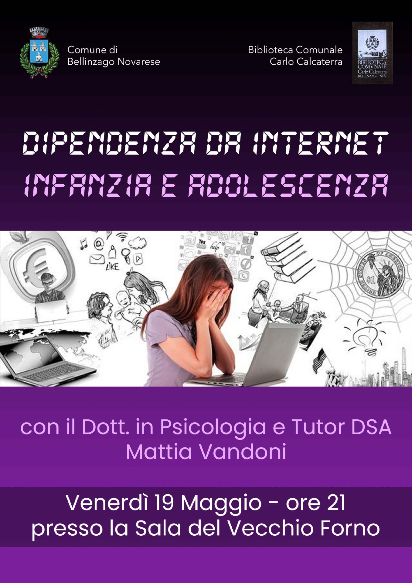 Il prossimo appuntamento sarà venerdì 19 maggio alle ore 21,00 presso la Sala Vecchio Forno, dove, alla presenza del Dott. in Psicologia e Tutor DSA Mattia Vandoni, si tratterà il tema attuale della dipendenza da Internet, con particolare attenzione rivolta alle fasce d’età di infanzia e adolescenza.