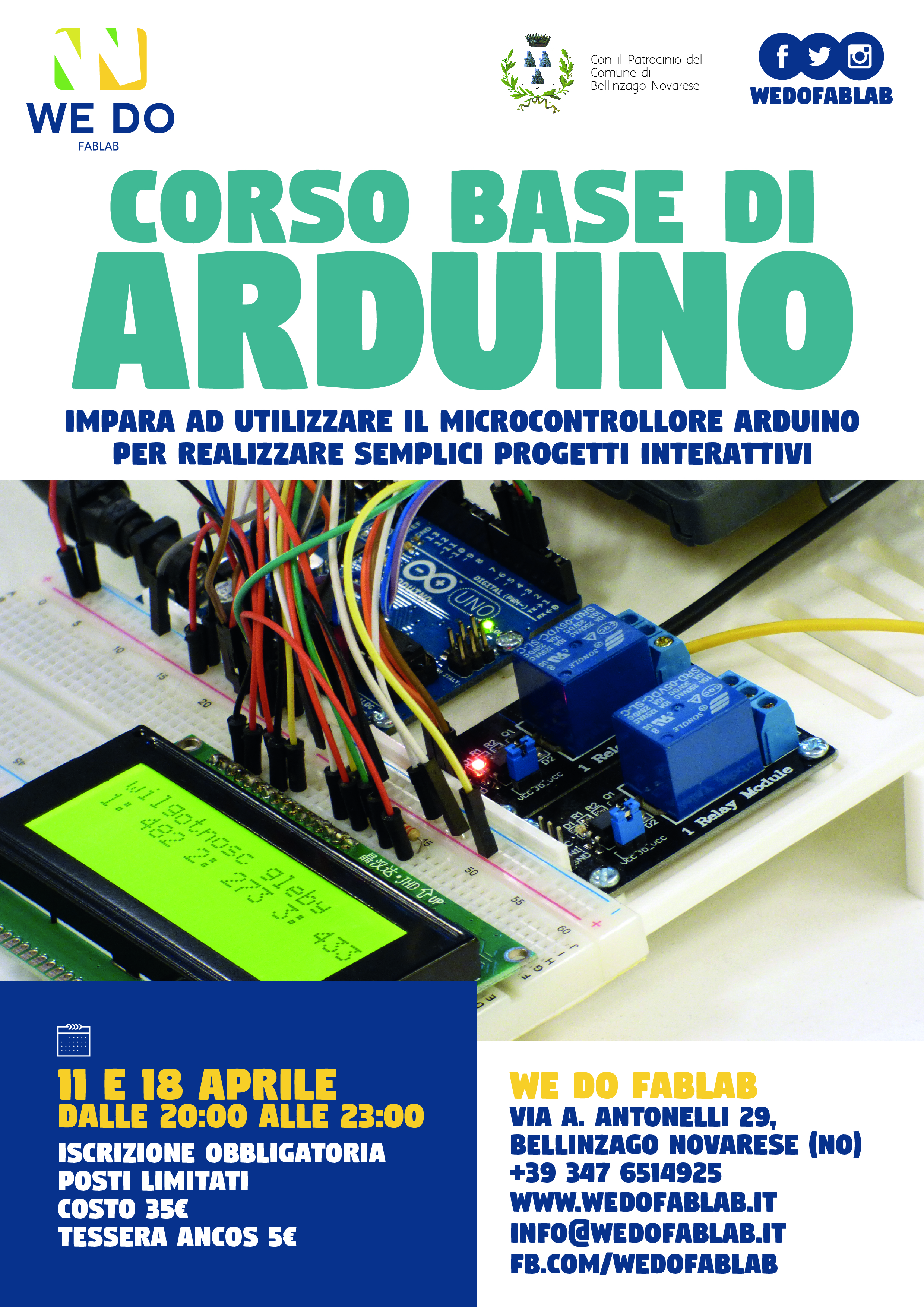 L'Associazione WE DO FABLAB organizza per l'11 e 18 aprile, dalle 20,00 alle 23,00, presso la sede di Via Antonelli, 29, un corso base per utilizzare il microcontrollore Arduino per la realizzazione di progetti interattivi semplici.