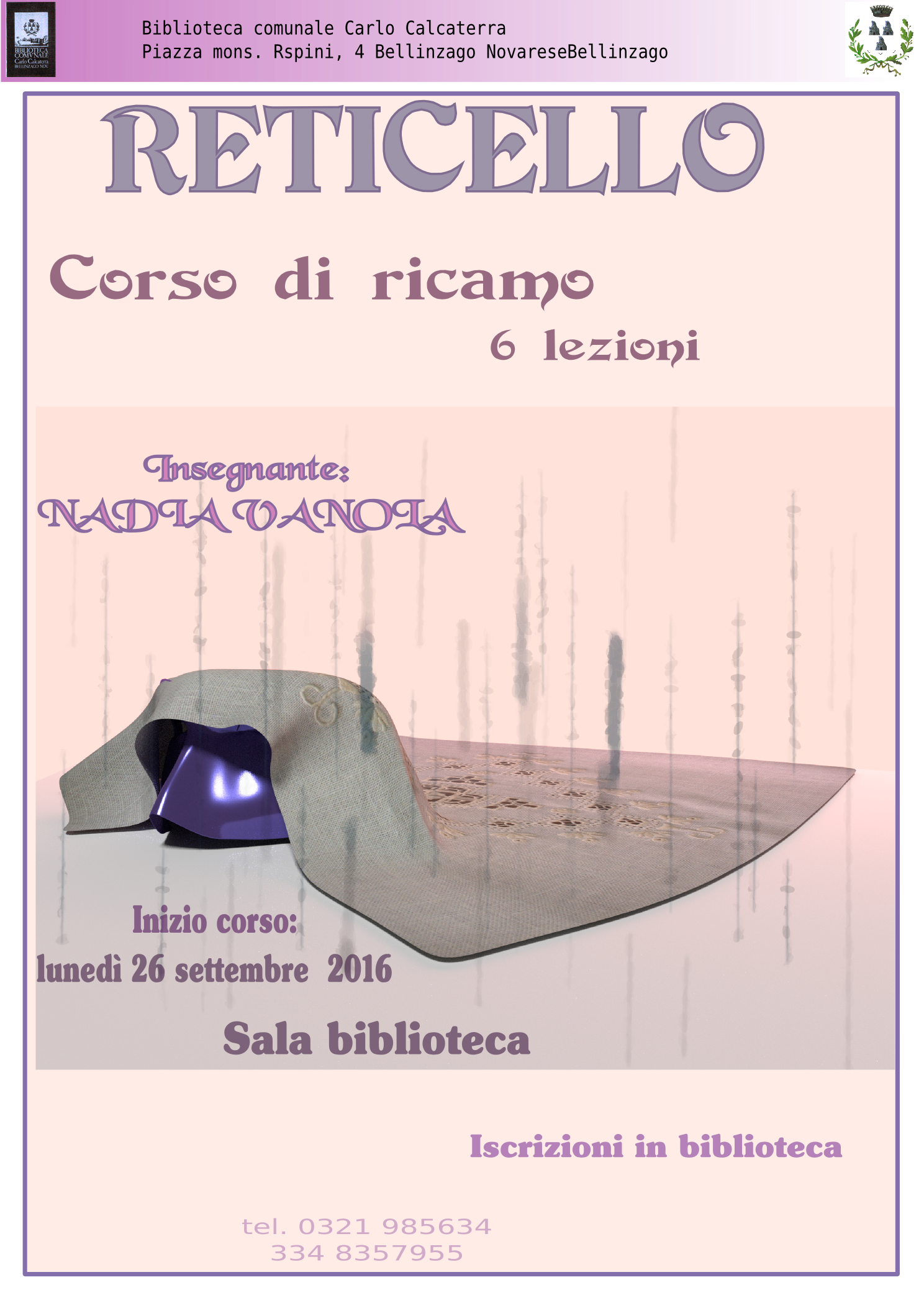 Presso la Biblioteca comunale sarà organizzato a partire da lunedì 26 settembre, alle 20,30, un corso di ricamo denominato "RETICELLO" tenuto dalla Sig.ra Nadia Vanola. Ogni corso prevede 6 incontri
