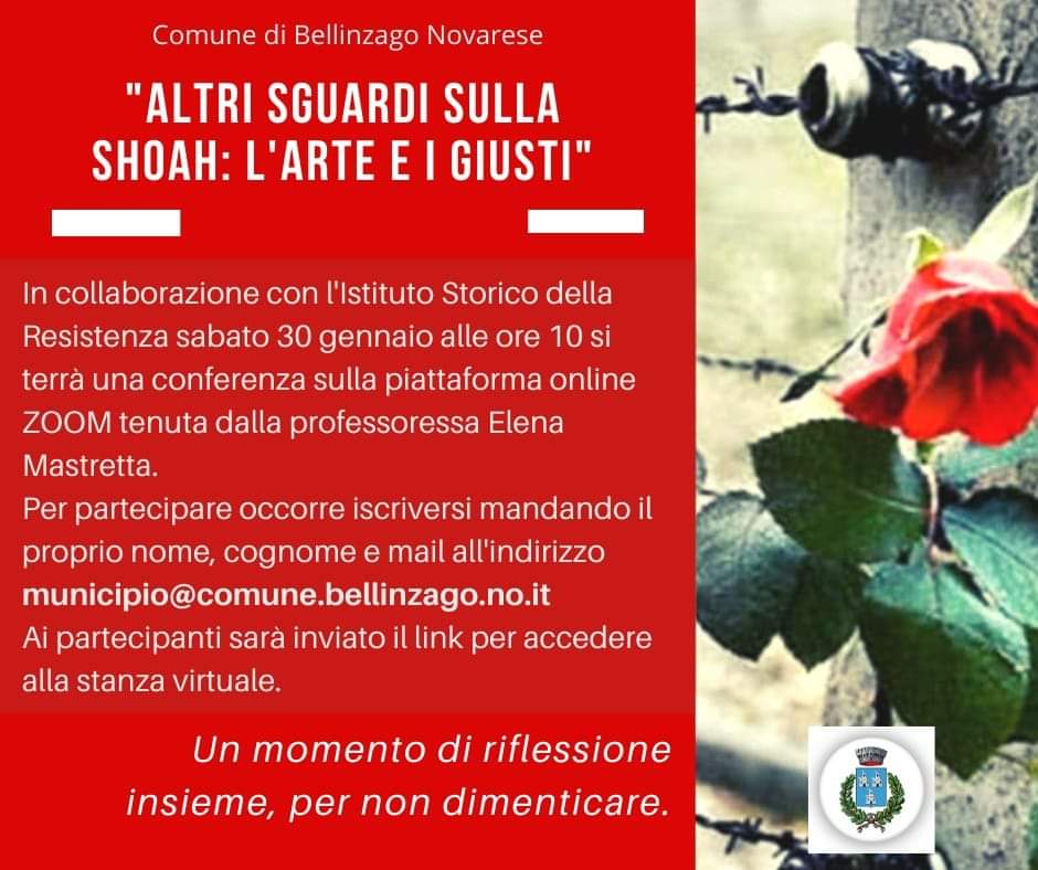 Sabato 30 gennaio 2021, alle ore 10.00, in prossimità della Giornata della Memoria, si terrà una conferenza dal titolo "Altri sguardi sulla Shoah: l'arte e i giusti", organizzata con la collaborazione dell'Istituto Storico della Resistenza e della Società Contemporanea del Novarese e del Verbano Cusio Ossola "Piero Fornara".