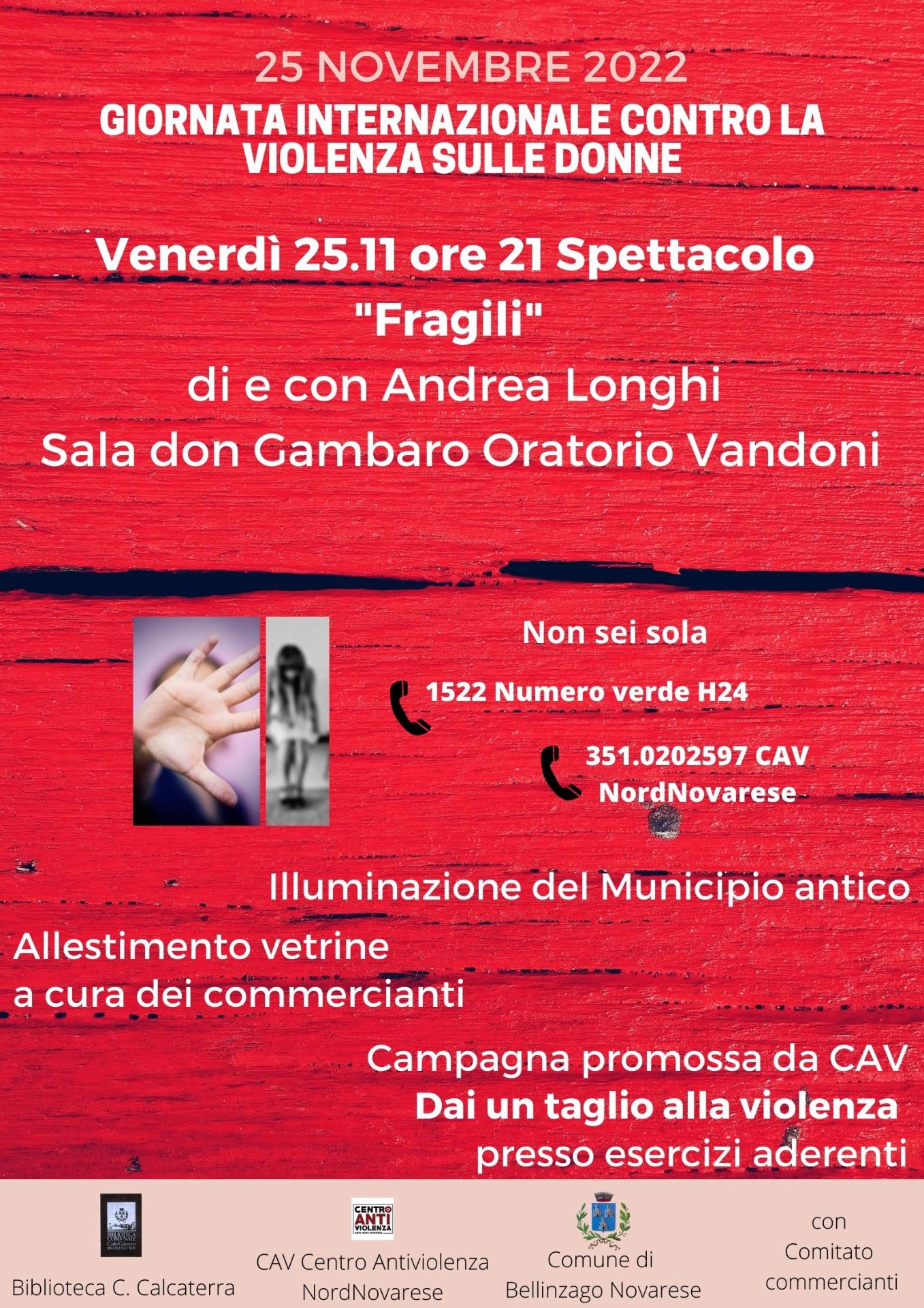In occasione della Giornata internazionale contro la violenza sulle donne, anche quest'anno sono previste a Bellinzago iniziative con il Centro Antiviolenza di Borgomanero e i commercianti ed artigiani del territorio. E' inoltre programmato uno spettacolo teatrale venerdì 25 alle 21 presso la Sala don Gambaro (Oratorio).
