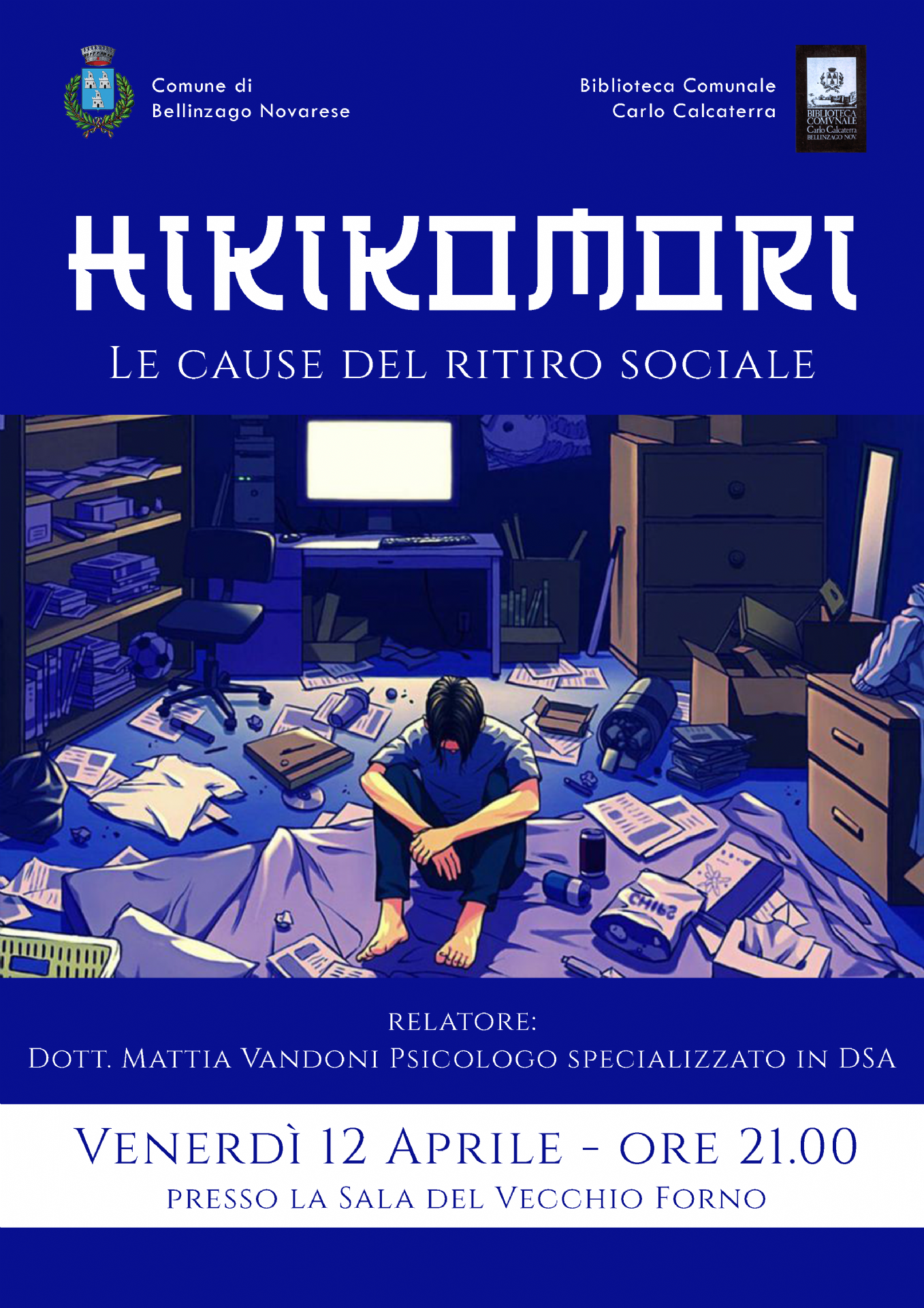 Venerdì 12 aprile alle ore 21.00, presso la Sala Vecchio Forno, il dott. Mattia Vandoni, psicologo specializzato in Disturbi specifici dell'apprendimento (DSA), ci parlerà degli Hikikomori e delle cause alla base di tale forma di ritiro sociale.