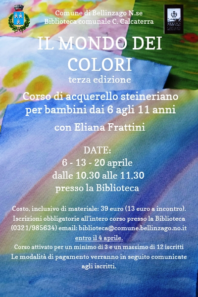 Dopo il successo delle due precedenti edizioni, ritorna il Mondo dei Colori, un corso di acquerello steineriano rivolto ai bambini dai 6 agli 11 anni tenuto da Eliana Frattini.