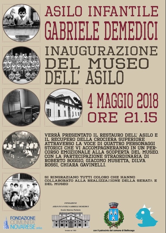 Venerdì 4 maggio 2018 ore 21.15 presso l'Asilo Infantile Gabriele Demedici, verrà presentato il restauro dell'Asilo e il recupero della crociera superiore attraverso la voce di quattro personaggi storici che vi accompagneranno in un percorso emozionale alla scoperta del Museo.