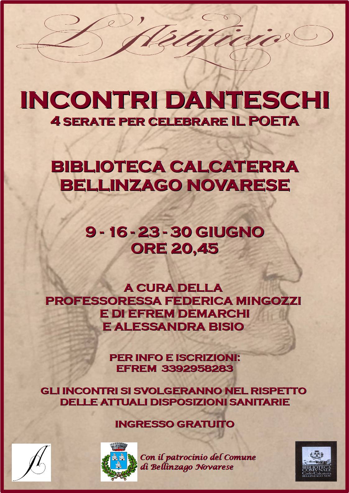 L'Associazione Culturale L'Artificio, con il patrocinio del Comune di Bellinzago Novarese, organizza quattro incontri per celebrare il Sommo Poeta Dante Alighieri, in occasione del Settecentesimo Anniversario della sua morte.