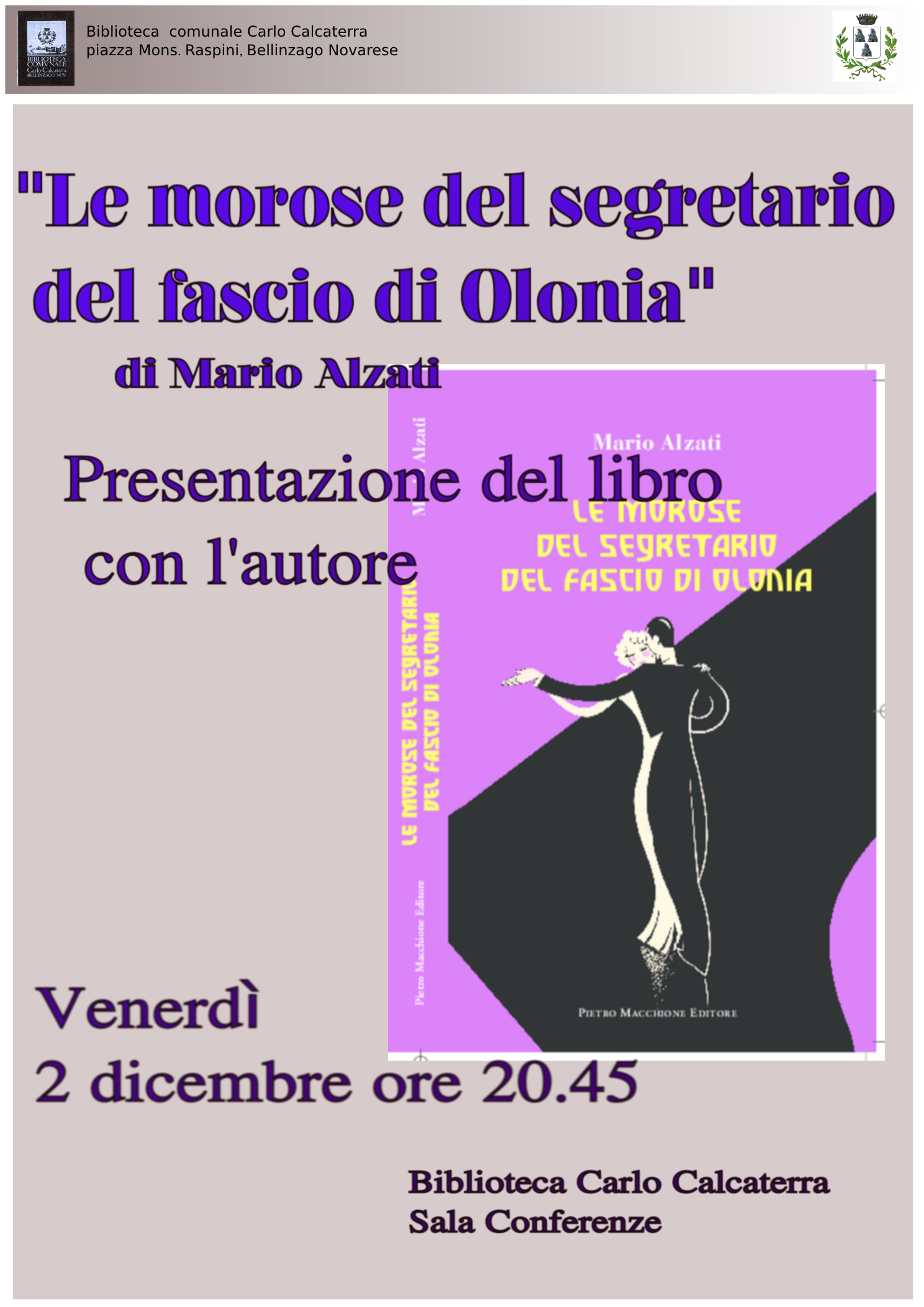 La Biblioteca comunale ha organizzato per Venerdì 2 dicembre prossimo, alle ore 21,00, presso la sala conferenze, l'incontro con MARIO ALZATI, autore del libro "Le morose del segretario del fascio di Olonia".