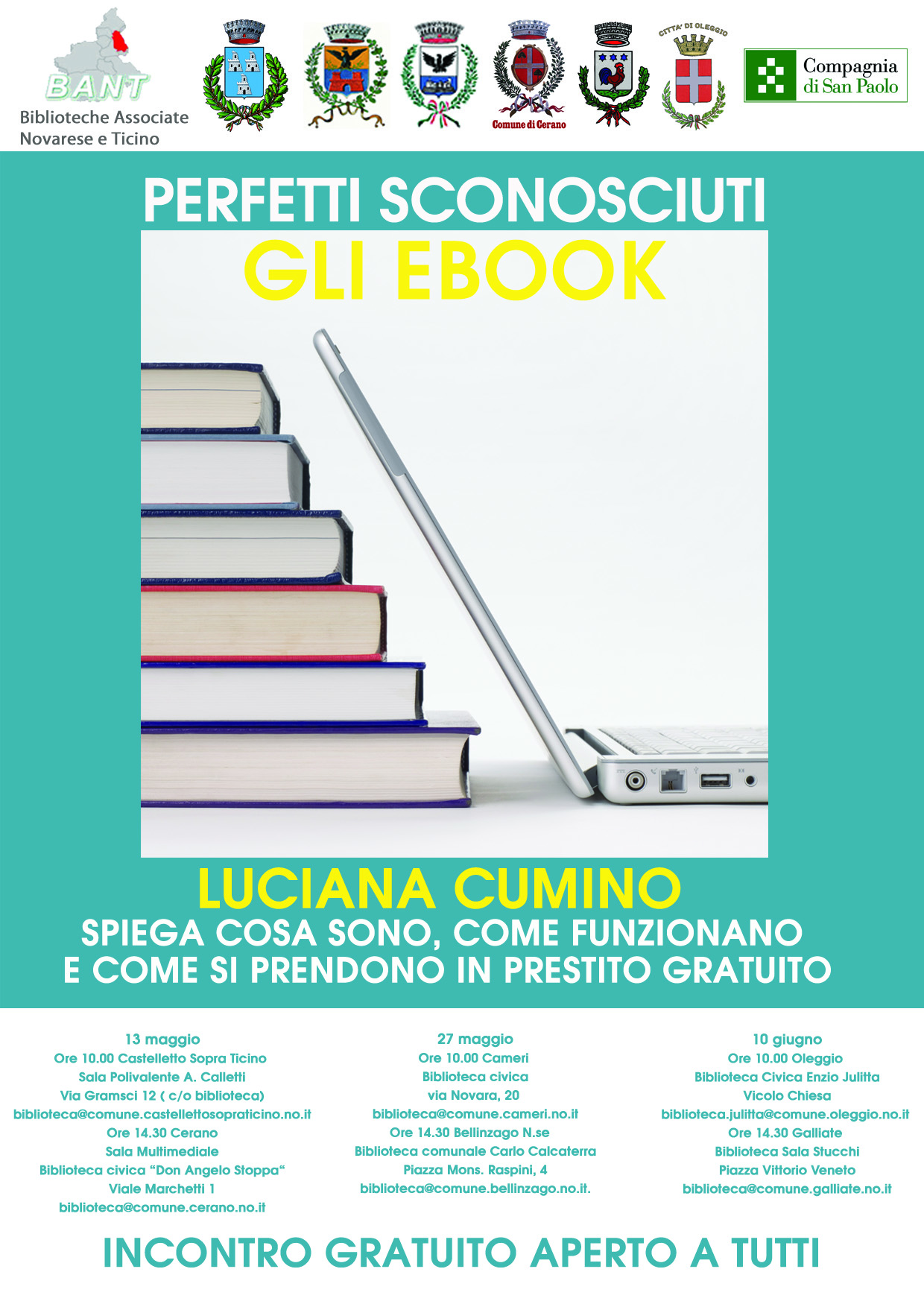 Sabato 27 maggio 2017 alle ore 14.30 presso la Biblioteca comunale di Bellinzago Novarese è stato organizzato, a cura delle 6 biblioteche costituenti il BANT, un incontro formativo rivolto a tutti coloro che sono interessati all'utilizzo del servizio di prestito digitale tramite e-book : come effettuare il prestito, anche da casa, ed eventualmente come configurare il book reader, che si potrà portare per un esempio pratico. L' incontro formativo sarà tenuto dalla Dott.ssa Luciana Cumino - Responsabile servizi telematici e multimediali della Biblioteca di Cologno Monzese ed esperta di risorse digitali. Gli e-book sono consultabili sul portale del Bant Https://bant.erasmo.it e scaricabili tramite il portale Rete Indaco.