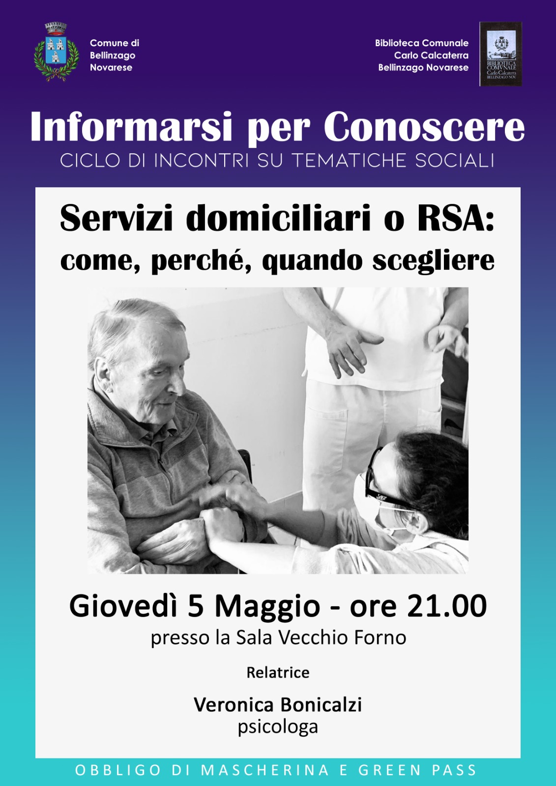 Nell'ambito della rassegna Informarsi per Conoscere, il Consiglio di Biblioteca propone per il prossimo giovedì, sempre al Vecchio Forno, una serata con la psicologa Veronica Bonicalzi sul tema 'Sevizi domiciliari o RSA: come, perché, quando scegliere'.