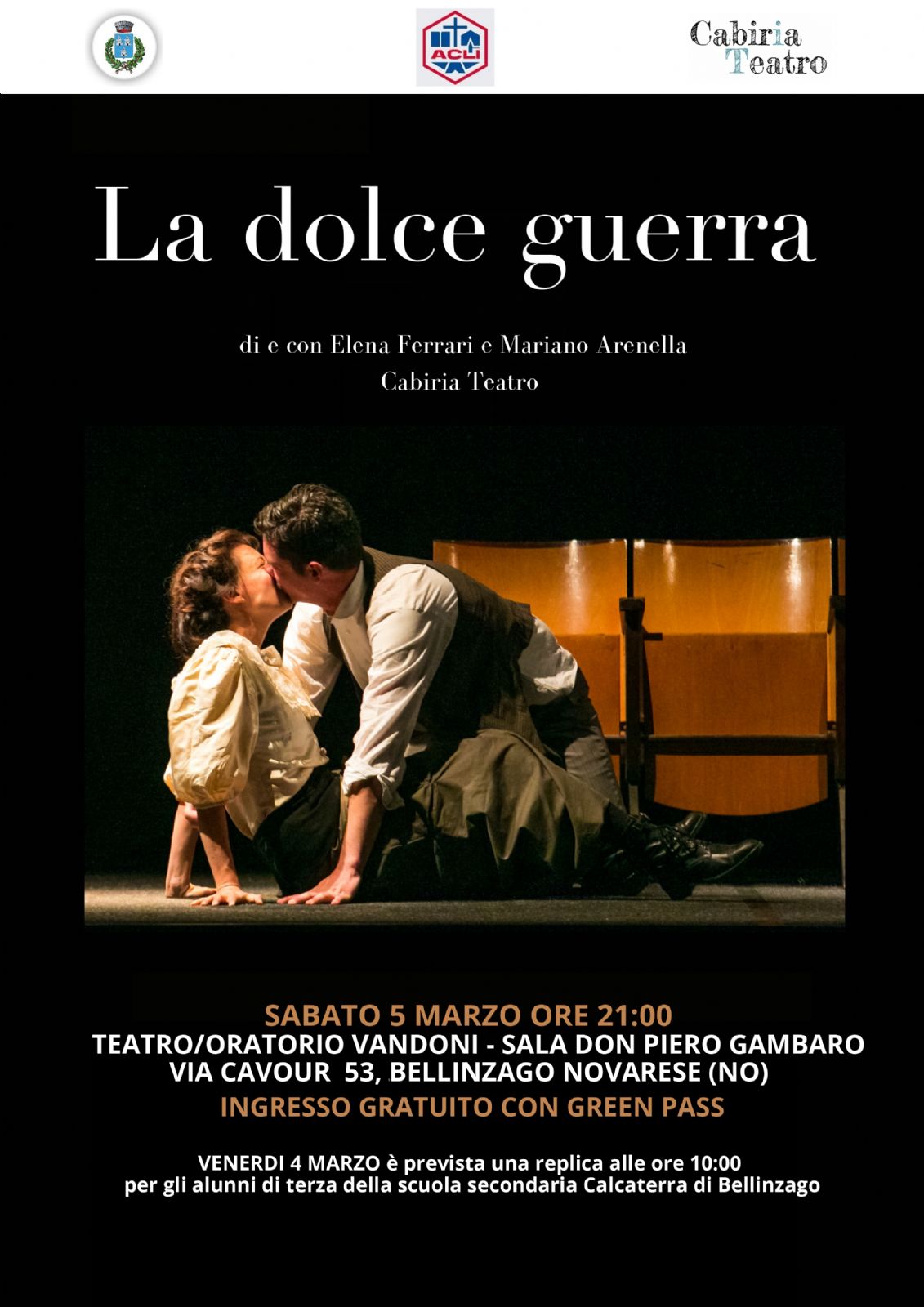 Grazie alla collaborazione e al supporto concreto delle Acli provinciali, il Comune di Bellinzago è onorato di offrire alla cittadinanza intera e agli alunni delle classi Terze della Scuola Secondaria di Primo Grado dell'Istituto Comprensivo Antonelli lo spettacolo teatrale 'La dolce guerra', ideato e messo in scena dalla compagnia Cabiria Teatro di Novara. L'evento imperdibile, segnalato da milanoteatri.it come uno dei migliori spettacoli della stagione 2015/2016, sarà rappresentato presso la Sala don Piero Gambaro dell'Oratorio Vandoni, che ringraziamo per la disponibilità, venerdì 4 mattina esclusivamente per le alunne e gli alunni e sabato 5 alle 21 per tutti i bellinzaghesi, muniti di green pass.