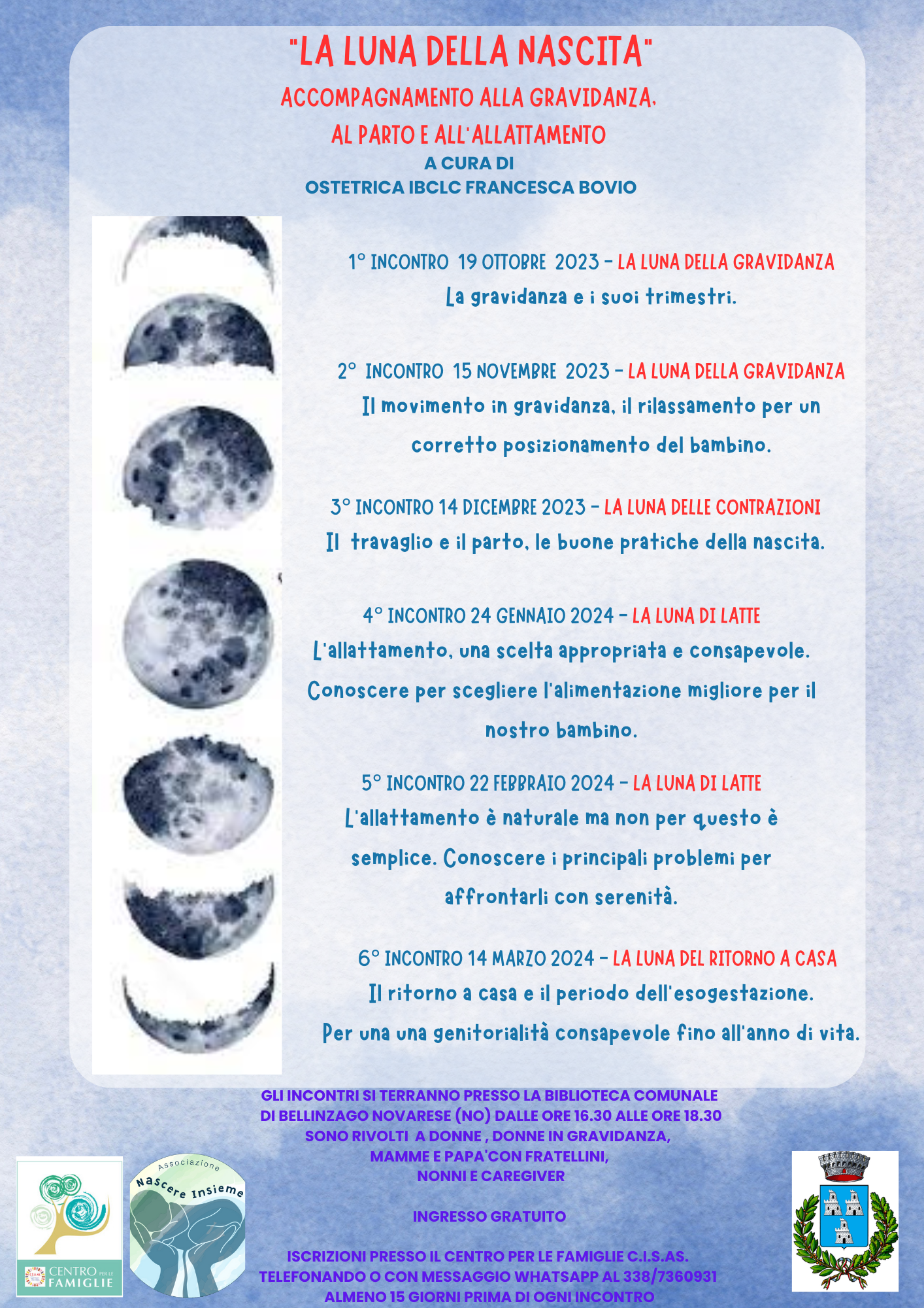 Il Comune di Bellinzago Novarese è lieto di presentare "La Luna della Nascita", un percorso di accompagnamento alla gravidanza, al parto e all'allattamento proposto dal Centro per le Famiglie - CISAS in collaborazione con il Comune e tenuto dall'ostetrica IBCLC Francesca Bovio.