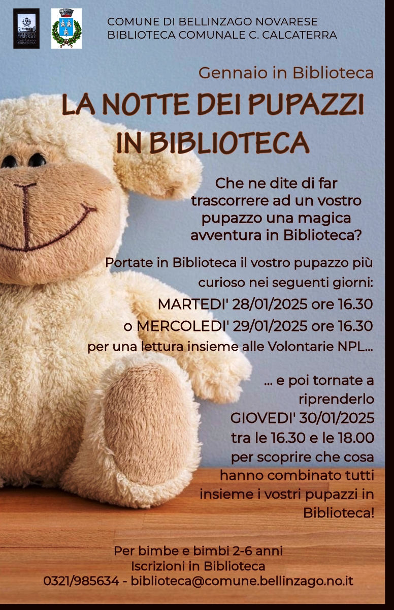 Portate in Biblioteca il vostro pupazzo più curioso MARTEDI' 28/01/2025 ore 16.30 o MERCOLEDI' 29/01/2025 ore 16.30 per una lettura insieme alle Volontarie NPL e poi tornate a riprenderlo GIOVEDI' 30/01/2025 tra le 16.30 e le 18.00 per scoprire che cosa hanno combinato tutti insieme i vostri pupazzi in Biblioteca!