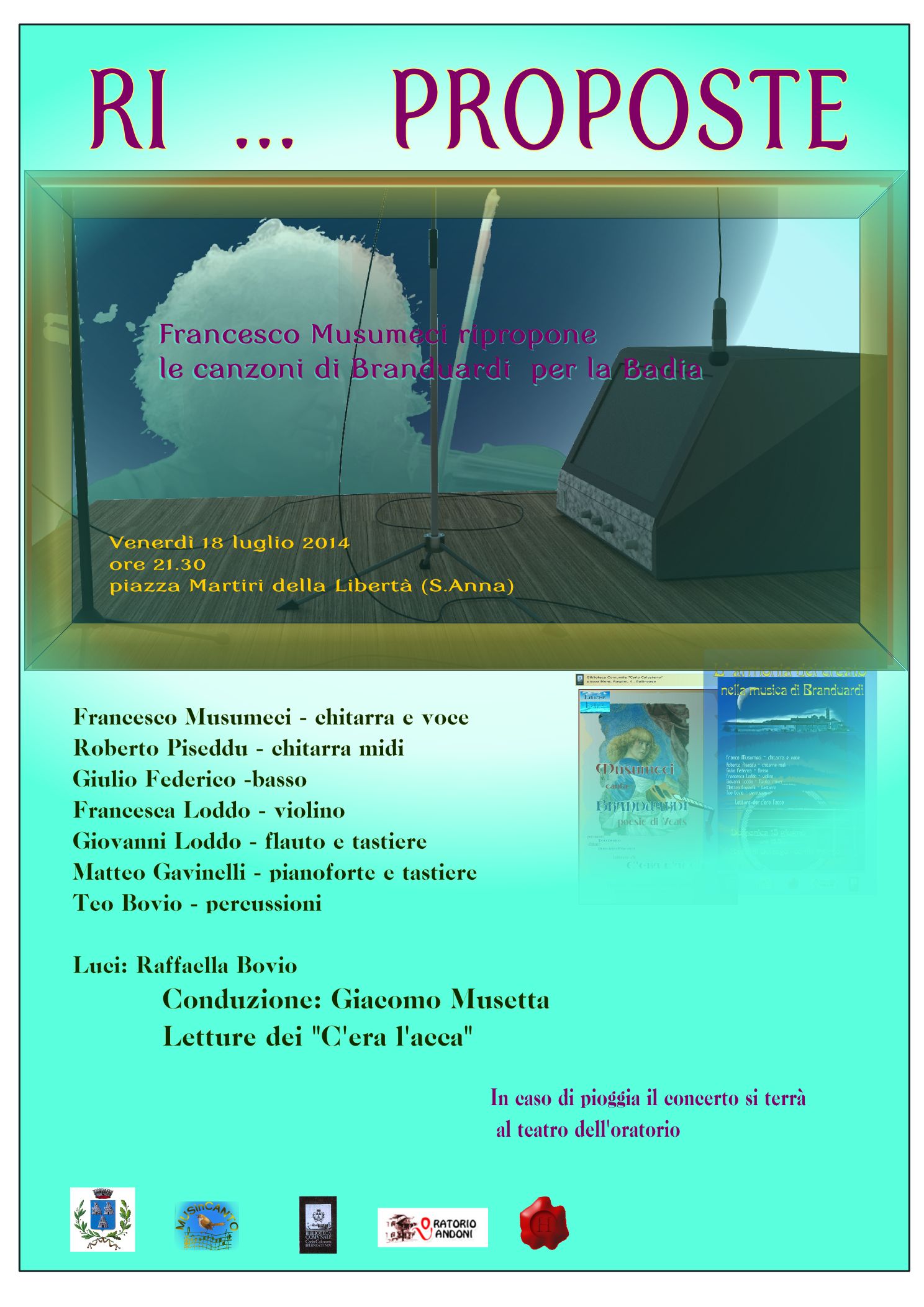 Venerdì 18 luglio, alle ore 21,30, in Piazza S. Anna, Francesco Musumeci riproporrà le canzoni di Branduardi eseguite in occasione della serata "L'armonia del creato nella musica di Branduardi" effettuata alla Badia di Dulzago.