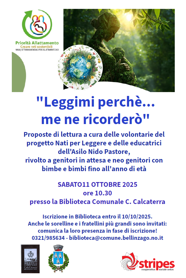 Ricordiamo che Sabato 11 ottobre 2025 alle ore 10.30, nell'ambito dell'iniziativa “Madre Natura e madri per la natura- allattamento e sostenibilità", la Biblioteca comunale C. Calcaterra accoglie le famiglie con l'iniziativa "Leggimi perchè... me ne ricorderò": una selezione di preziose e utili proposte di lettura a cura delle volontarie del Progetto Nati per Leggere e delle educatrici dell'Asilo Nido Pastore dedicate ai genitori in attesa e ai genitori con bimbe e bimbi fino all'anno di età.