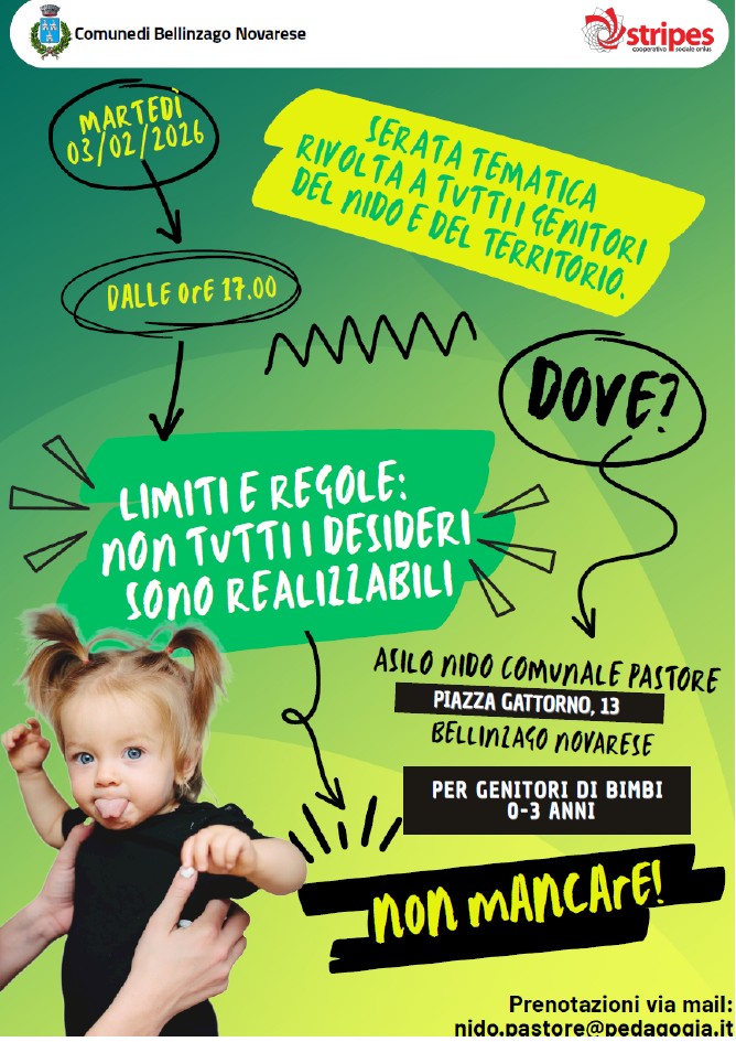 Martedì 3 febbraio, alle ore 17.00, l'Asilo Nido Pastore propone una serata tematica di incontro e confronto condotto dalla dott.ssa Sara Pisano, pedagogista della cooperativa sociale Stripes per l'Asilo nido, per parlare di limiti e regole nell'educazione, rivolta a tutti i genitori del Nido e del territorio, con particolare attenzione alla fascia di età 0-3 anni.