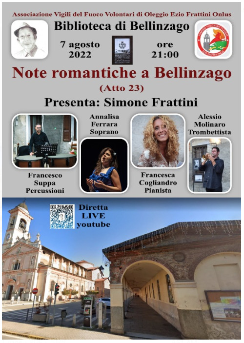Il 7 agosto alle ore 21.00, presso il cortile della Biblioteca, si terrà il concerto Note romantiche a Bellinzago, organizzato in collaborazione con l'Associazione Vigili del Fuoco Volontari di Oleggio Ezio Frattini Onlus.