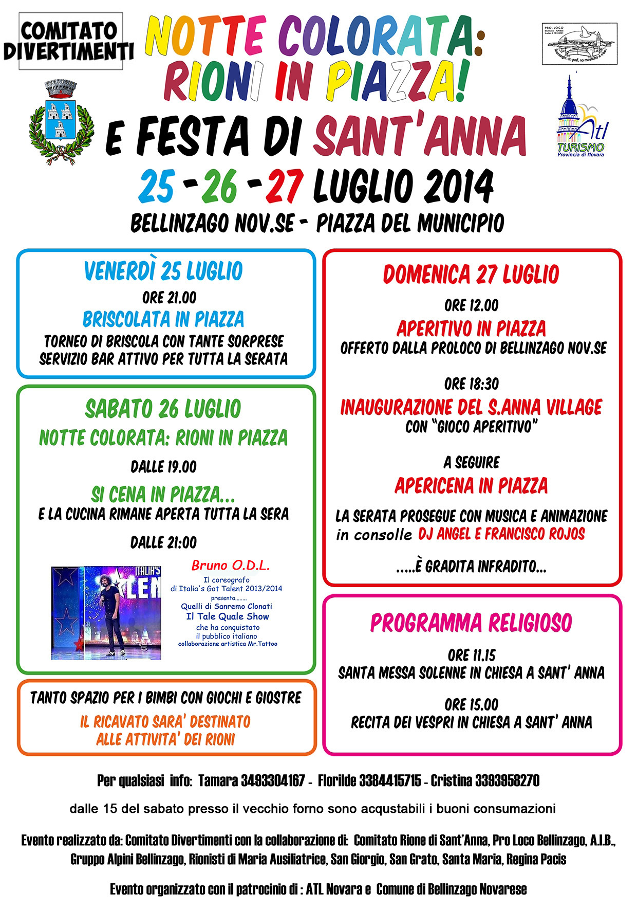 Il Comitato Divertimenti di Bellinzago Novarese organizza per il 25 - 26 e 27 luglio in Piazza del Municipio la : NOTTE COLORATA: RIONI IN FESTA e la Festa di SANT'ANNA.