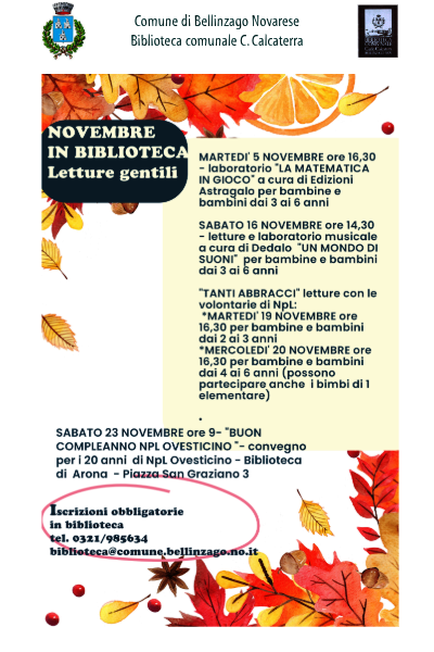 E'obbligatorio iscriversi alle iniziative entro il giorno precedente all'attività chiamando la Biblioteca allo 0321/985634 oppure scrivendo a biblioteca@comune.bellinzago.no.it. In caso di impossibilità a partecipare è gradito segnalare l'assenza alla Biblioteca.