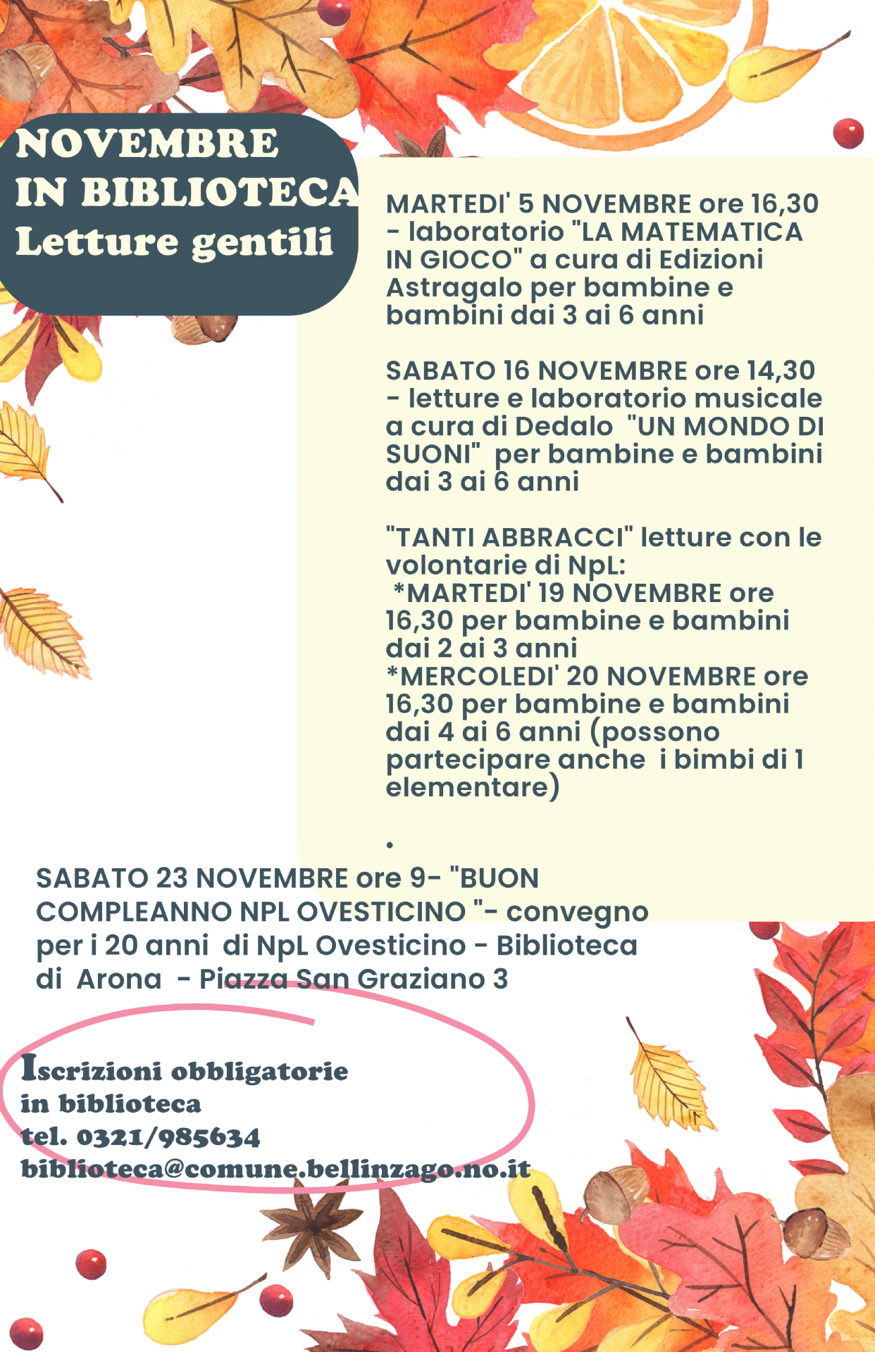Continuano anche nel mese di novembre le iniziative del Progetto Nati per Leggere rivolte a bambine e bambini nella fascia 0-6 anni. Un mese speciale, in cui il Coordinamento Nati per Leggere Ovest Ticino spegne le sue prime 20 candeline: dal 2004 le biblioteche del Coordinamento, che nel tempo sono diventate quattordici, sono attive sul territorio offrendo servizi ai bambini della fascia 0-6 anni e alle loro famiglie.