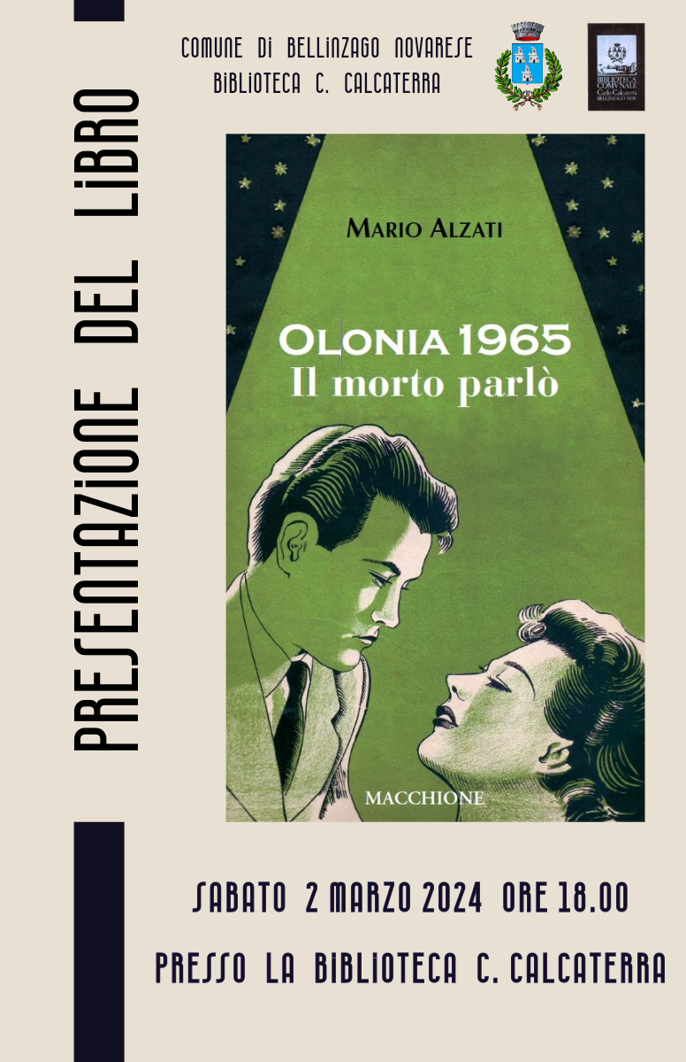 Sabato 2 marzo alle ore 18.00, presso la Biblioteca comunale Calcaterra, Mario Alzati presenterà il suo libro "Olona 1965. Il morto parlò", il nono romanzo che l'autore ambienta a Olonia per raccontare vicende e costumi della profonda provincia lombarda, con gli avvenimenti che hanno segnato la storia del Novecento a far da sfondo.