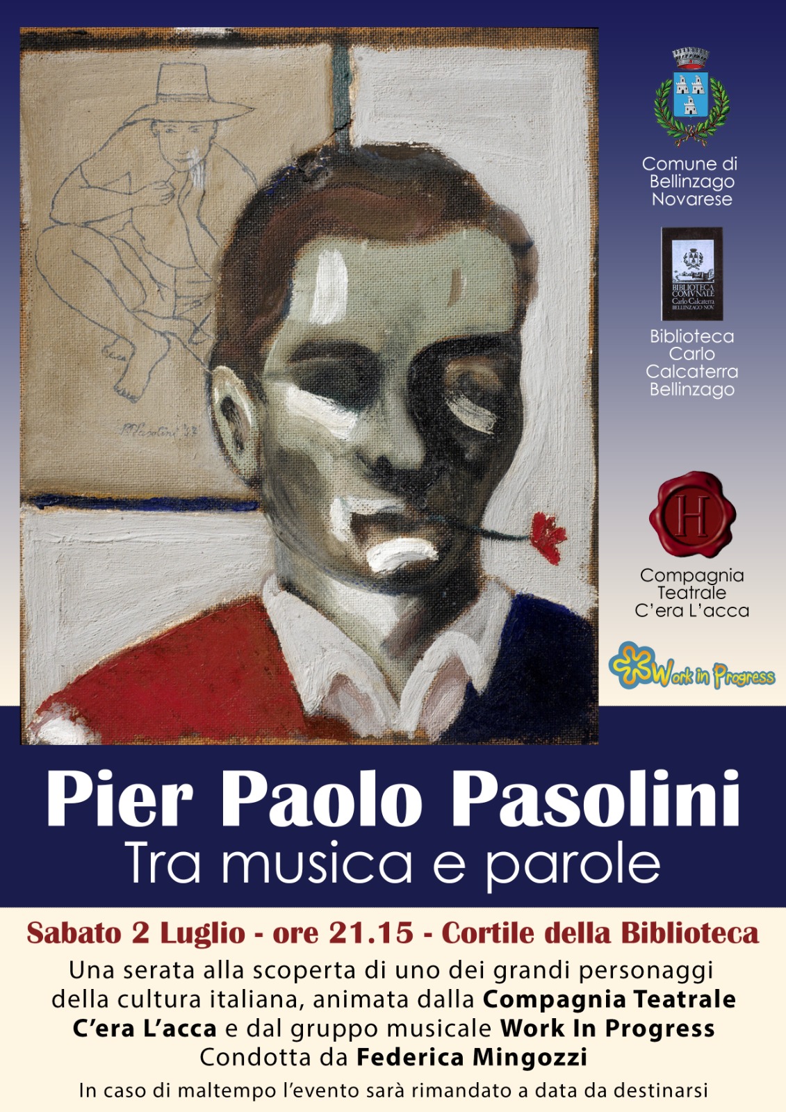 Nel centenario dalla nascita di uno degli intellettuali più arguti, colti e profondi del Novecento italiano, Bellinzago ricorda Pier Paolo Pasolini in un'intensa serata, tra musica, parole ed immagini, sabato 2 luglio, alle ore 21.15, presso il cortile della biblioteca comunale.