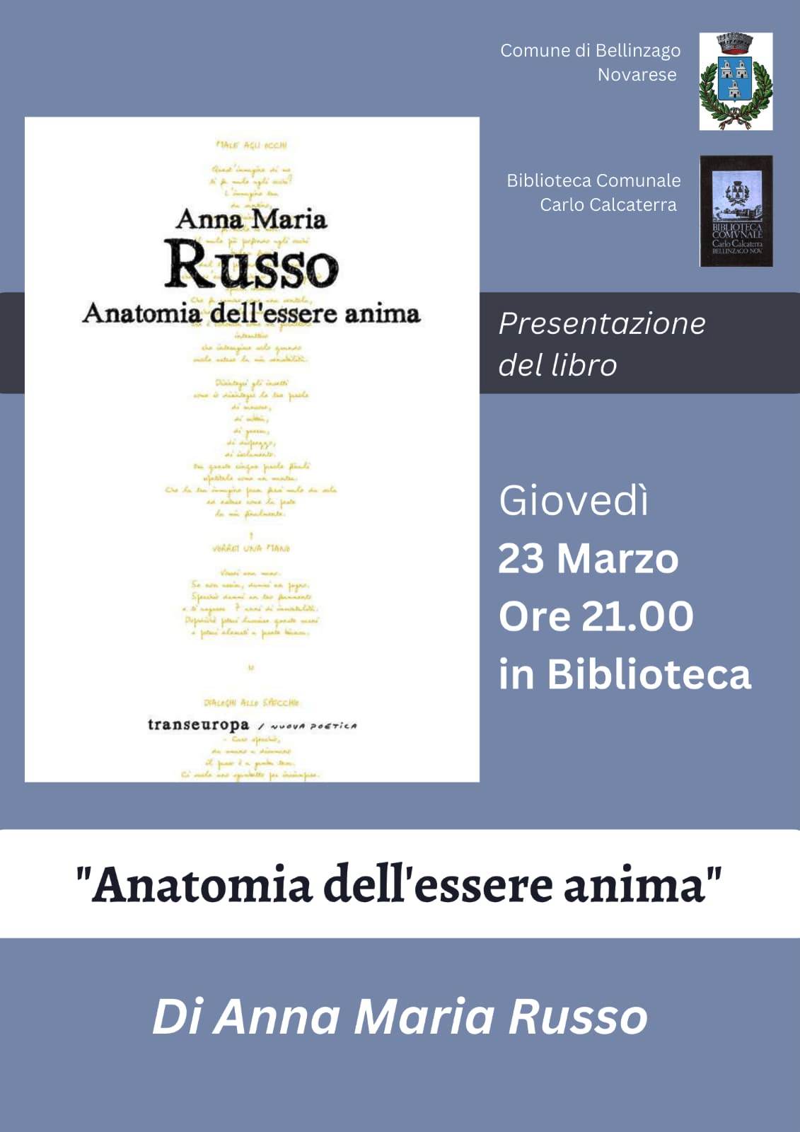 Giovedì 23 marzo, alle ore 21.00, presso la Biblioteca comunale Calcaterra, l'autrice Anna Maria Russo presenterà la sua opera "Anatomia dell'essere anima".