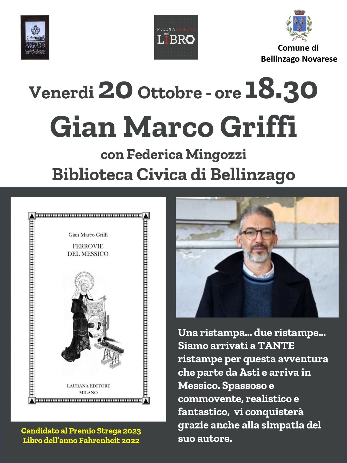 Il 20 ottobre alle ore 18.30 la Biblioteca comunale Calcaterra ha l'onore di ospitare, grazie alla collaborazione con il Libraio Fabrizio Merletti della Piccola Officina del Libro di Oleggio, l'autore Gian Marco Griffi, candidato al Premio Strega con l'opera Ferrovie del Messico, di cui dialogherà insieme a Federica Mingozzi e a tutto il pubblico presente.
