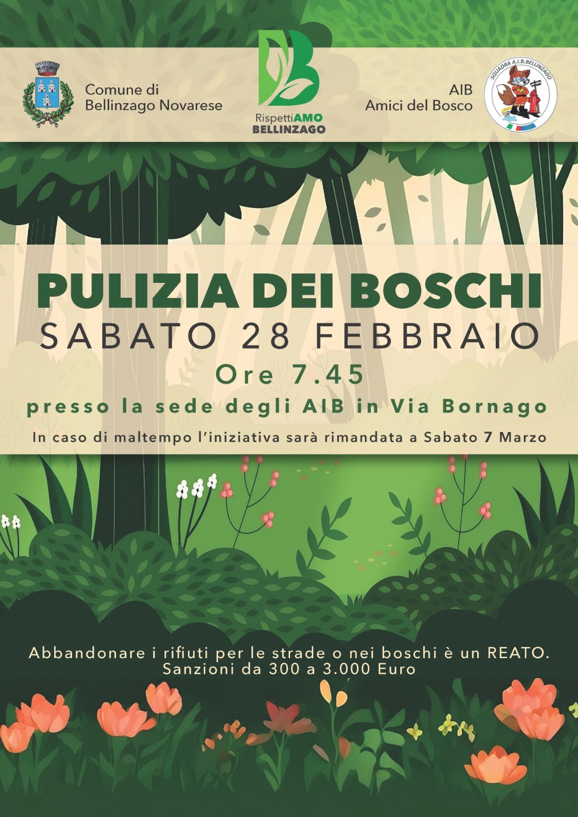 Sabato 28 febbraio ritorna l'appuntamento con la pulizia dei boschi, l'iniziativa promossa da AIB e Associazione Amici del Bosco per responsabilizzare, coinvolgendo attivamente la comunità, verso la cura del proprio ambiente naturale.